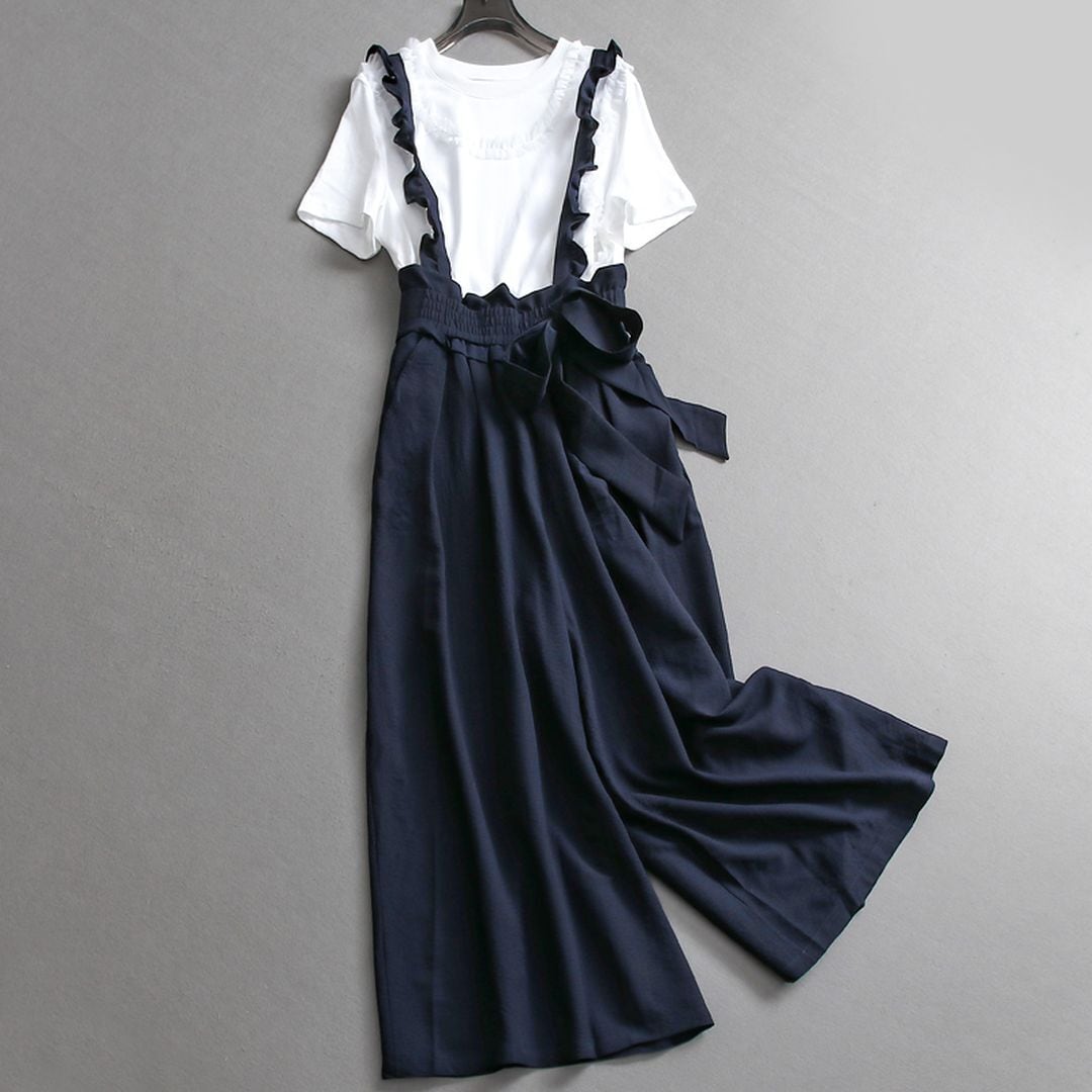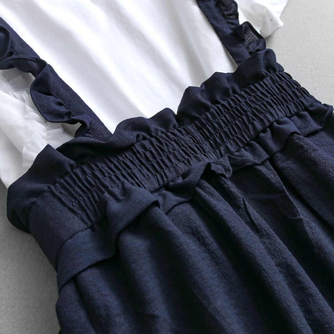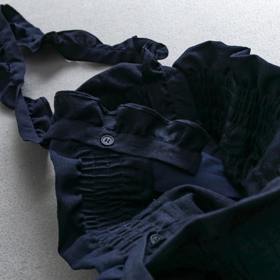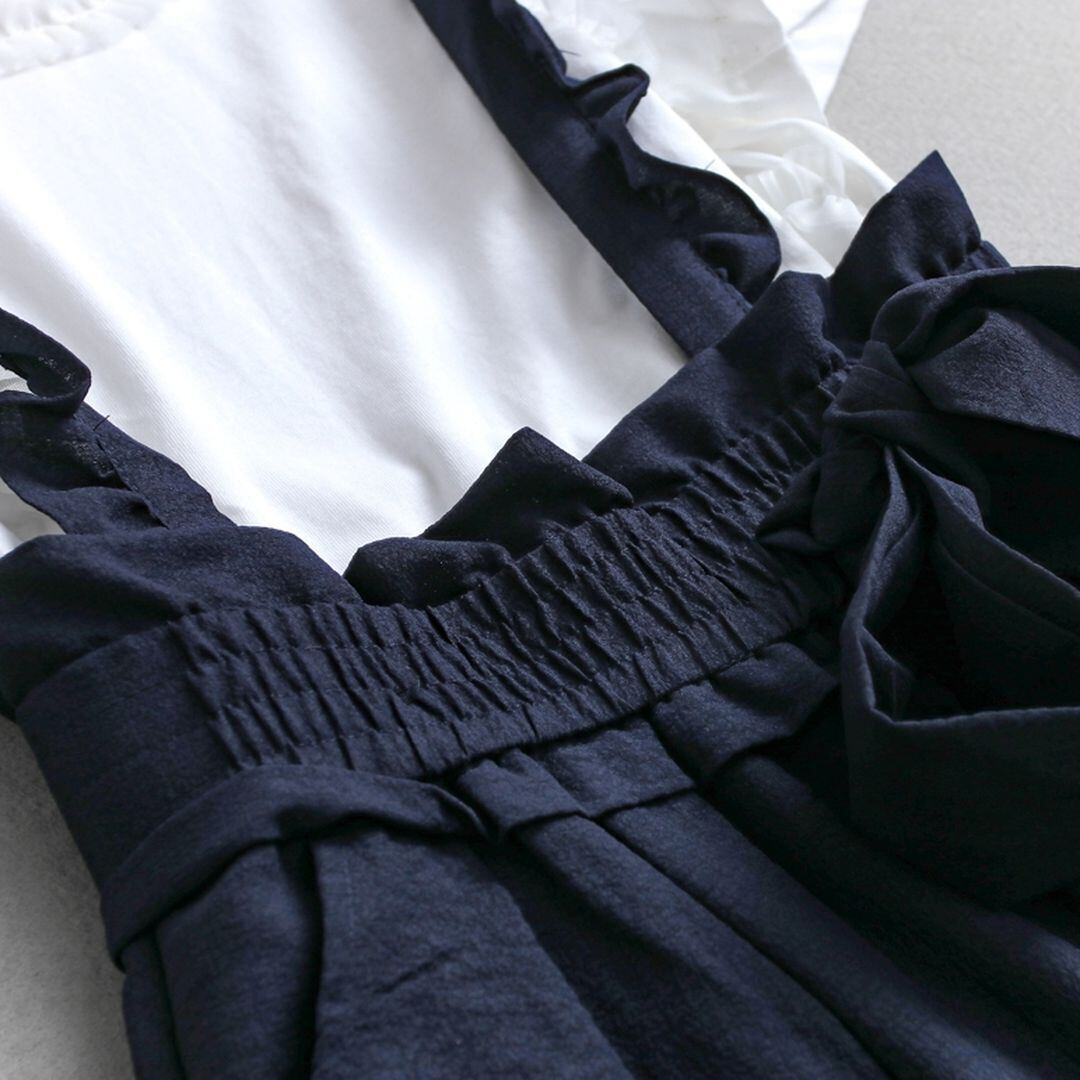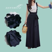 肩紐のフリルとウエストのリボンがポイントの女性らしいサロペットです