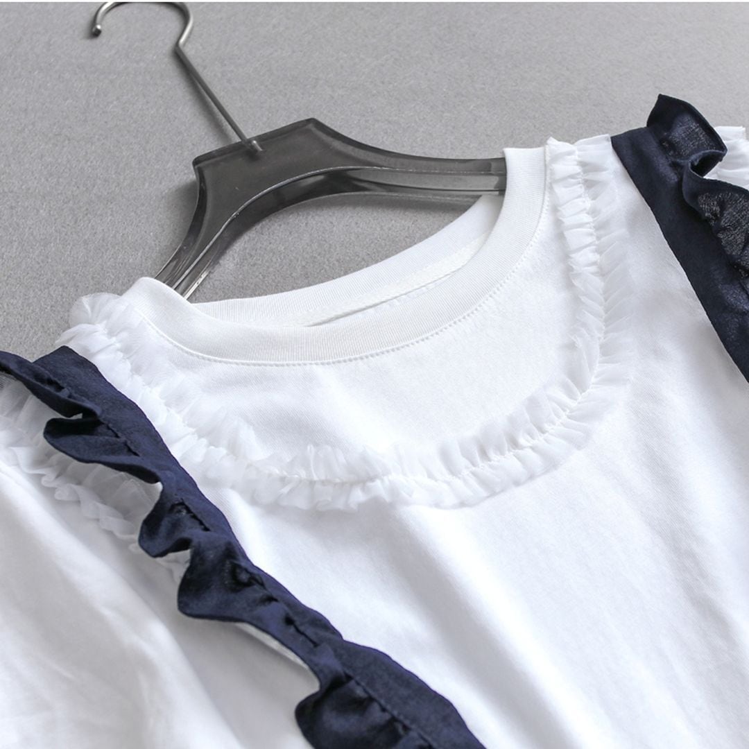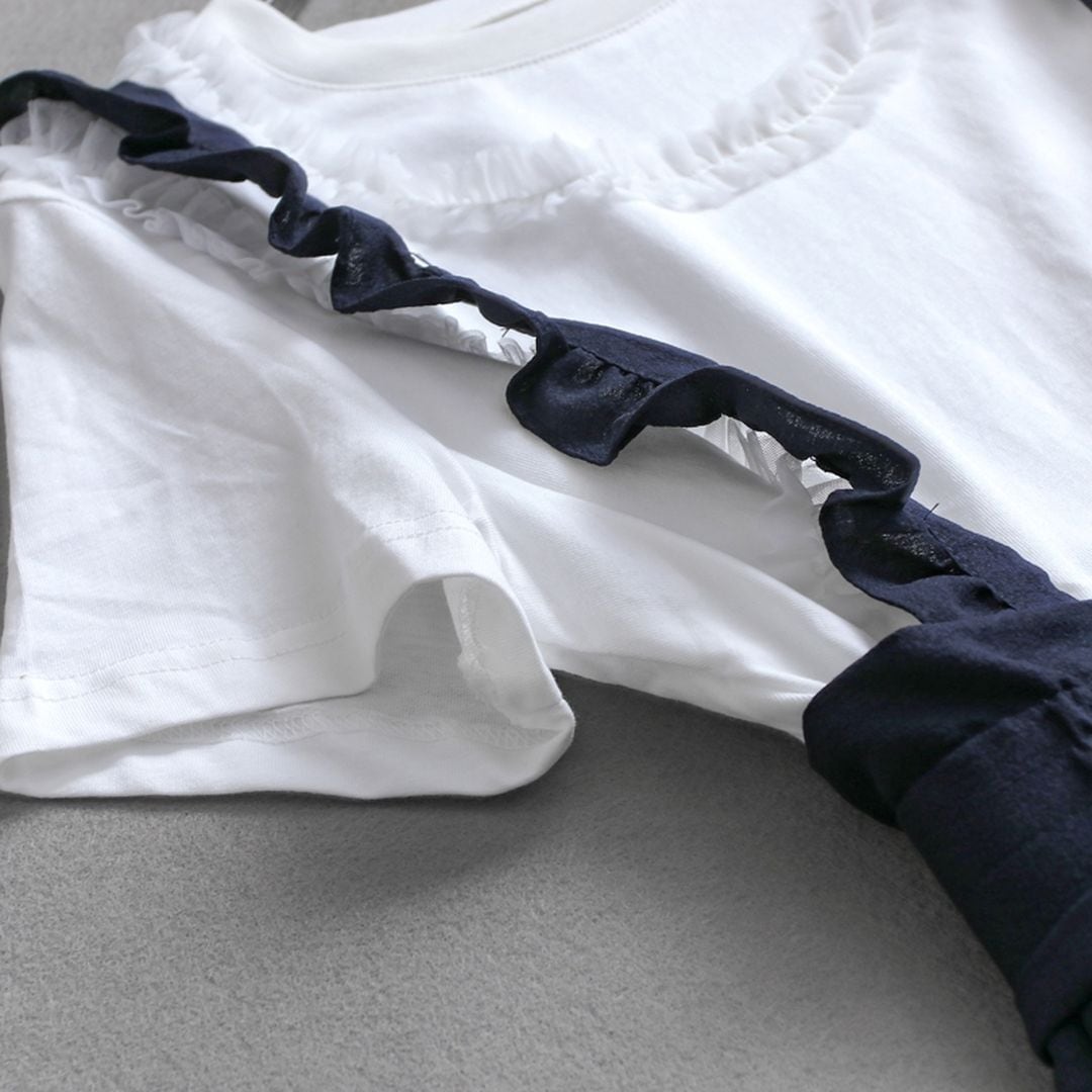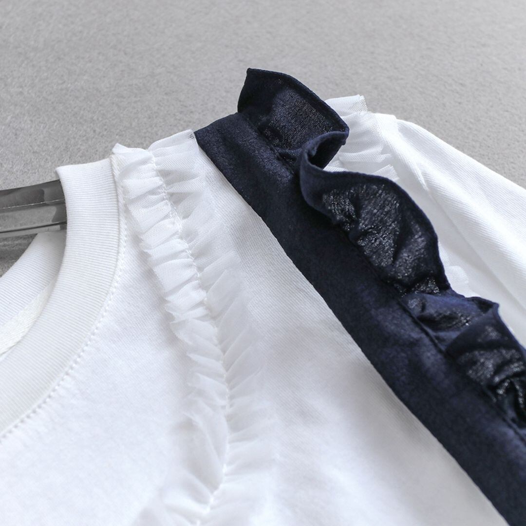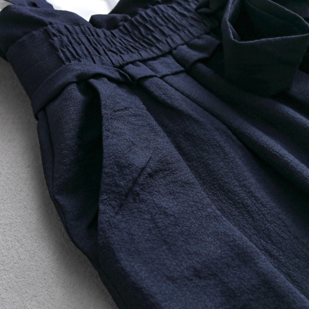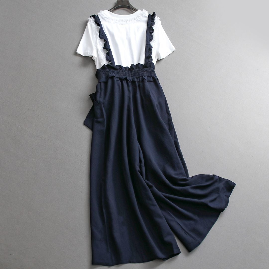肩紐のフリルとウエストのリボンがポイントの女性らしいサロペットです