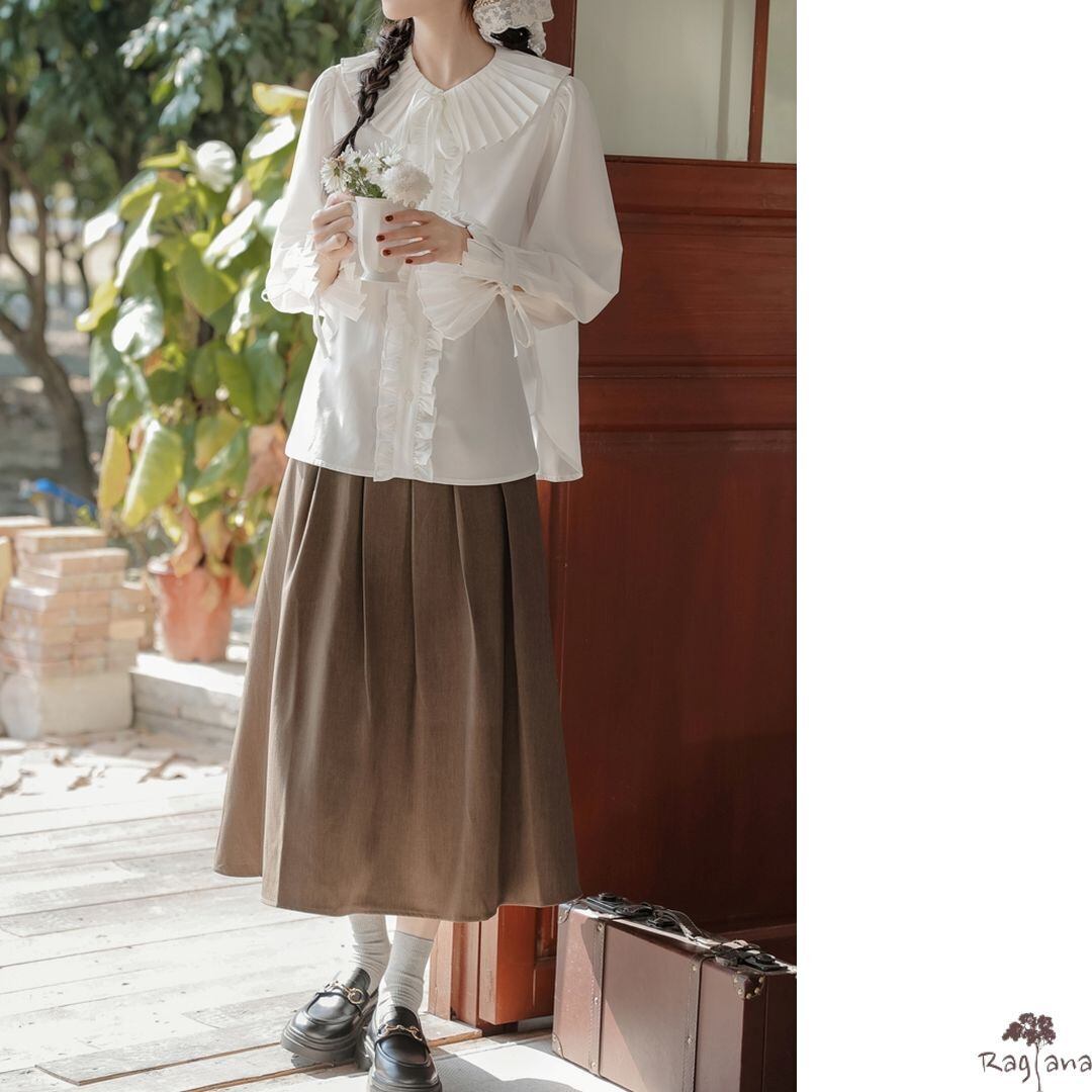 プリーツの襟とカフスが可愛らしいブラウスです。