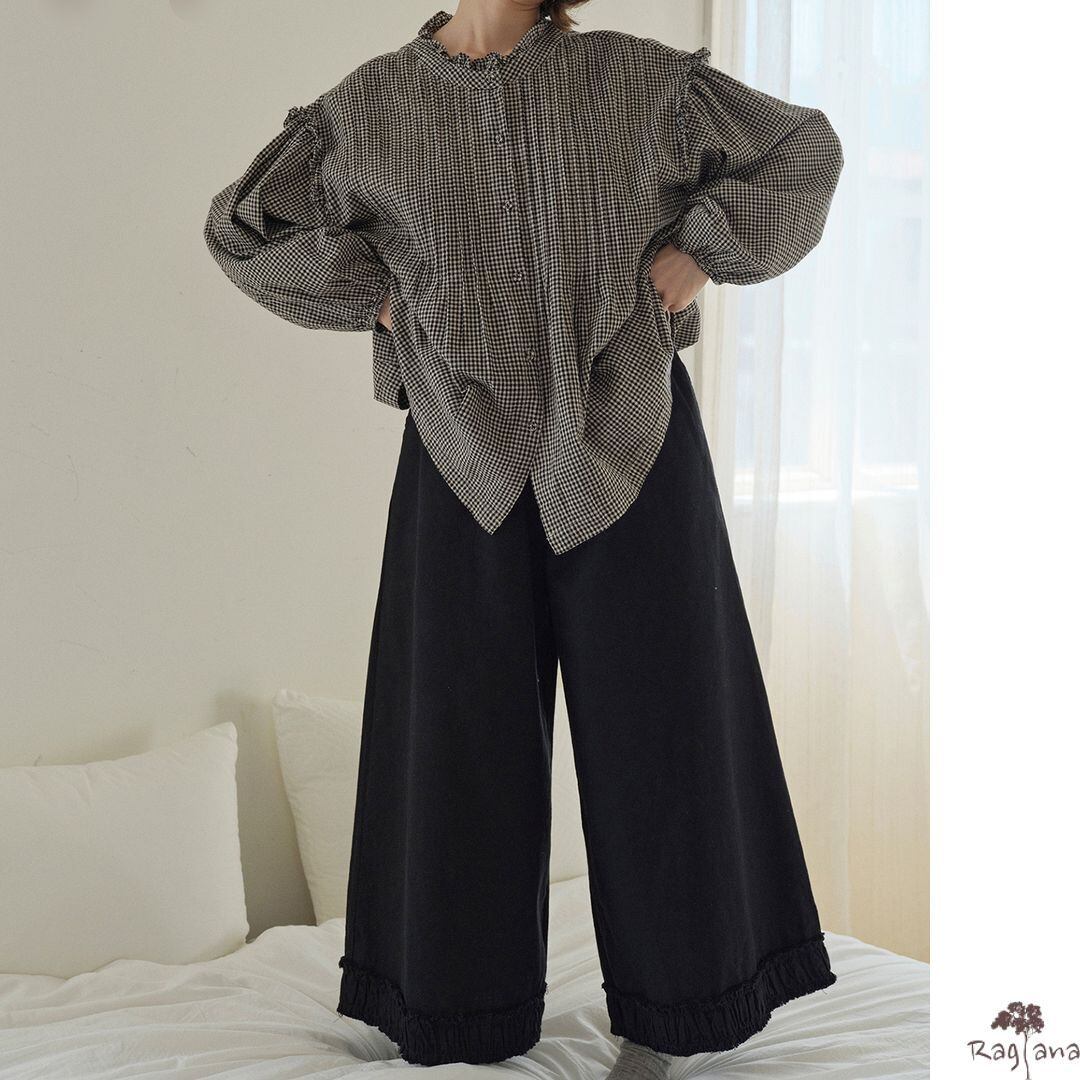 裾のギャザーが可愛らしいワイドパンツです。