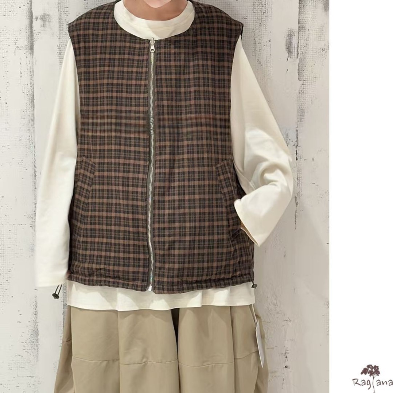 チェック柄と無地のリバーシブルベストです。