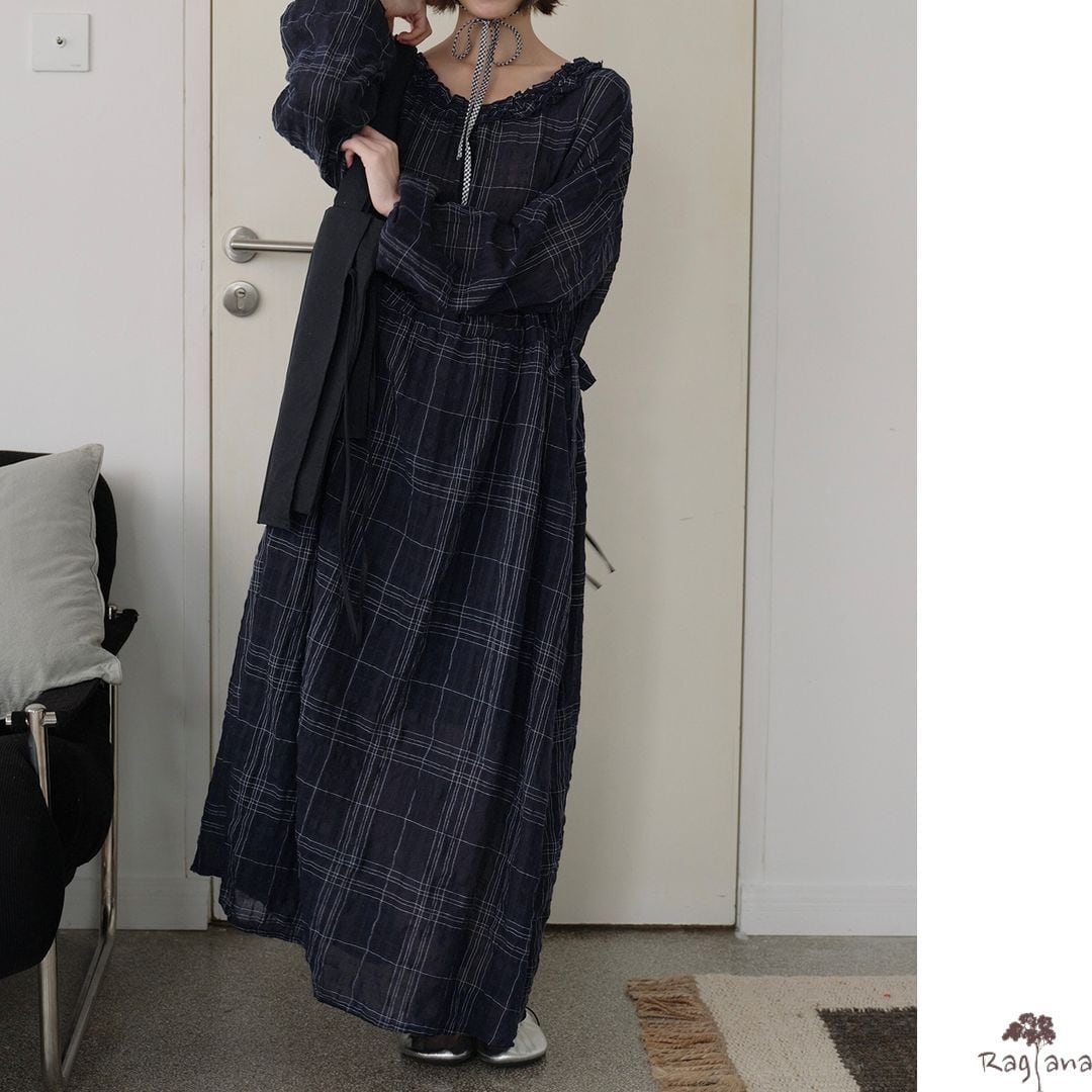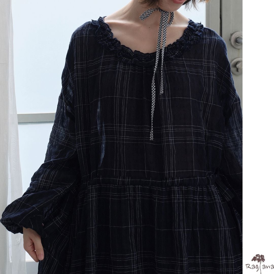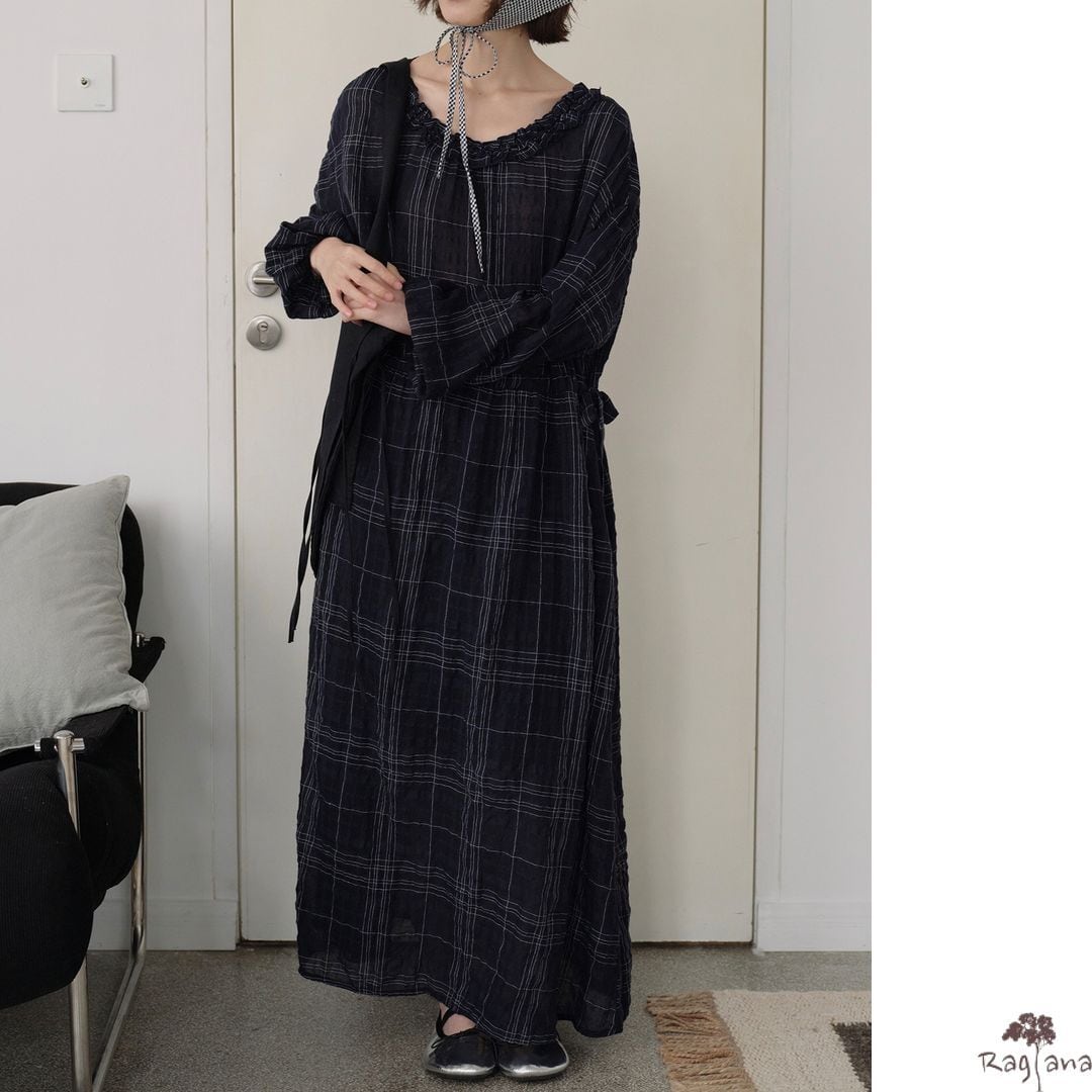 フリルのネックラインとカフスが可愛らしいワンピースです。