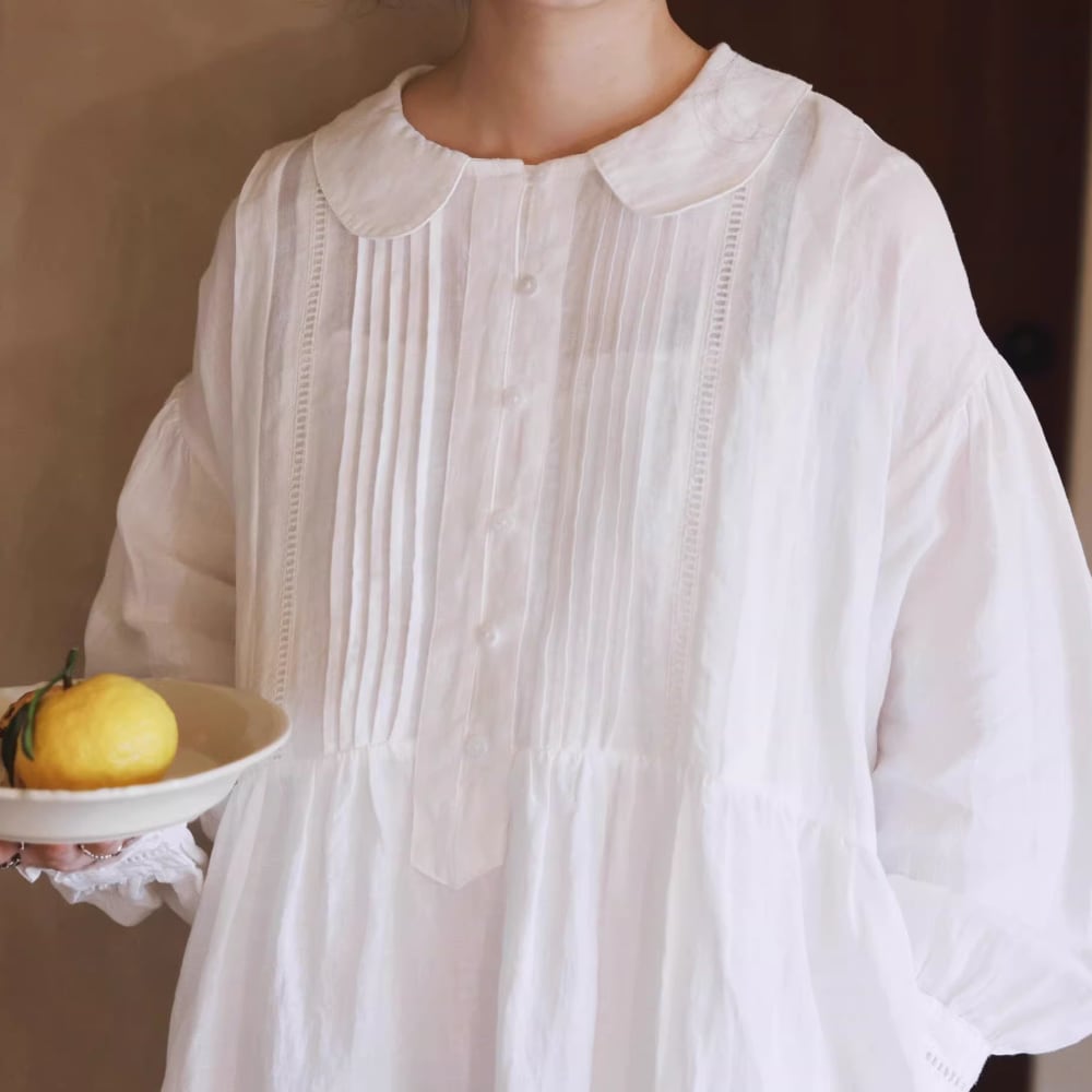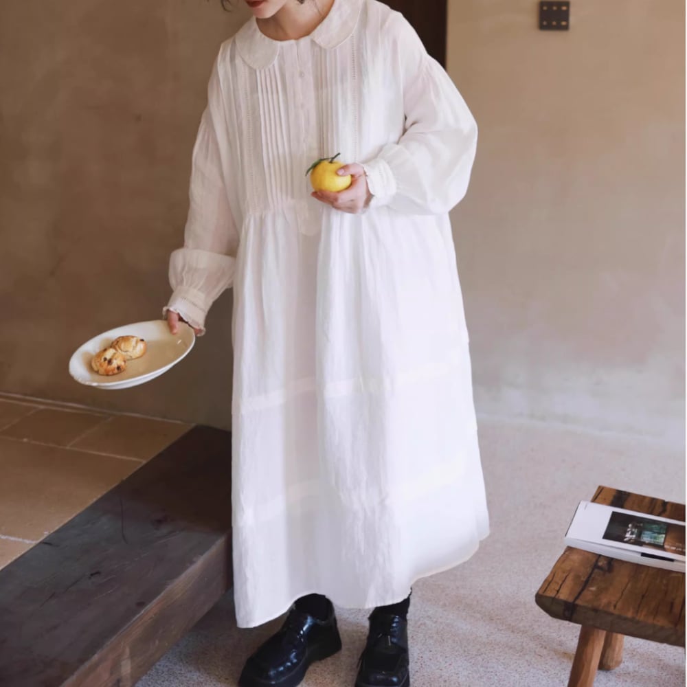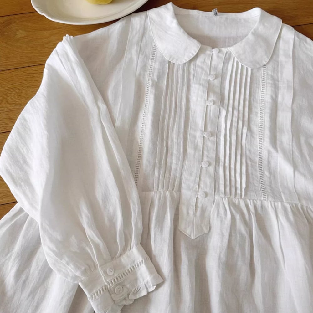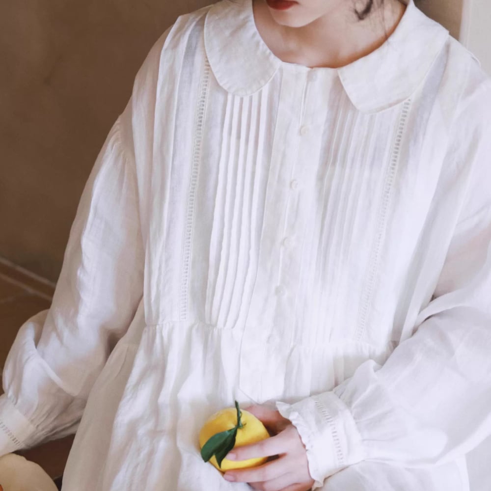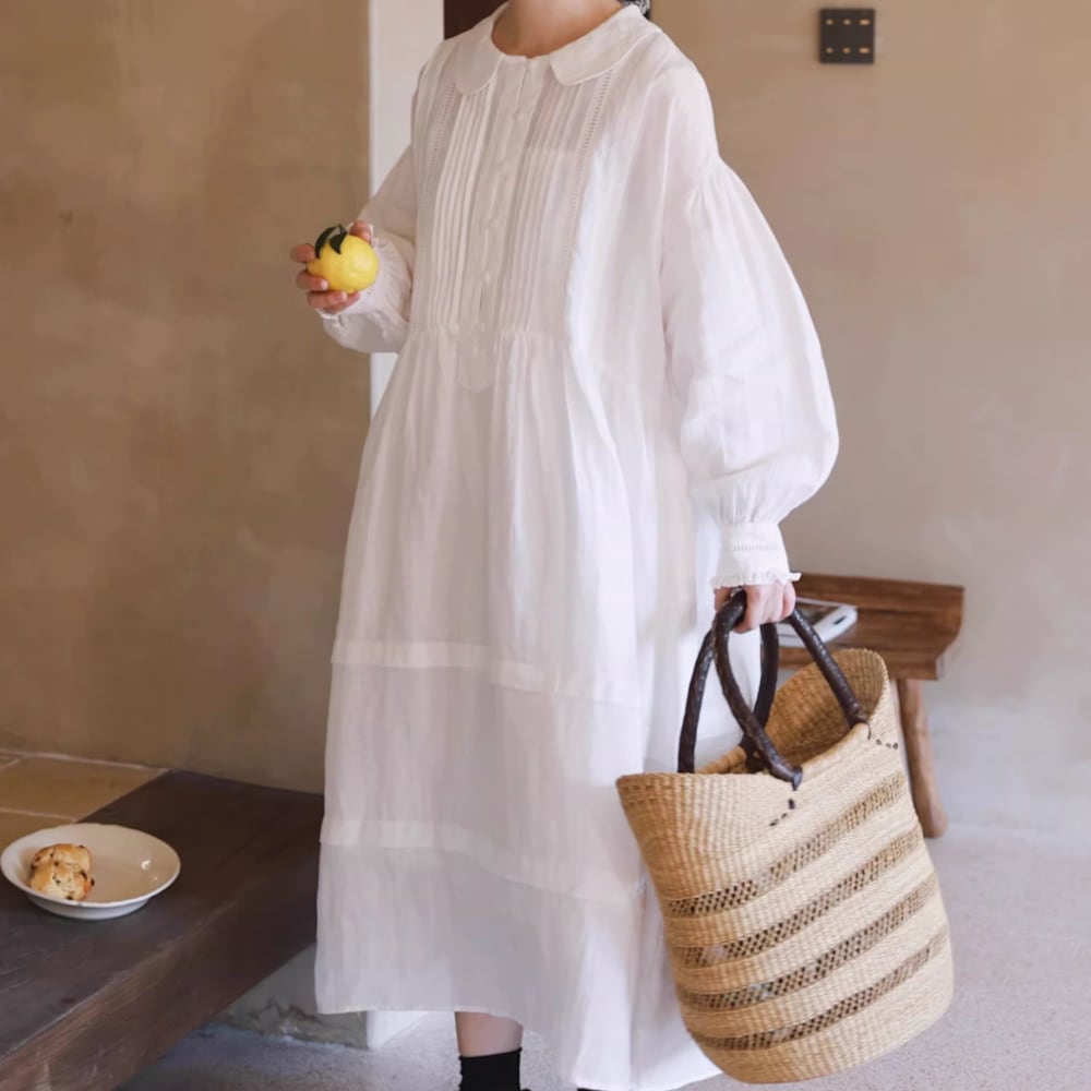 ピーターパンカラーと、胸元のピンタックが可愛いリネンワンピース。