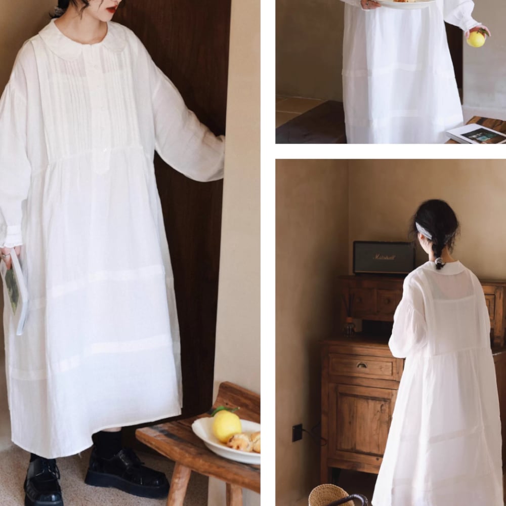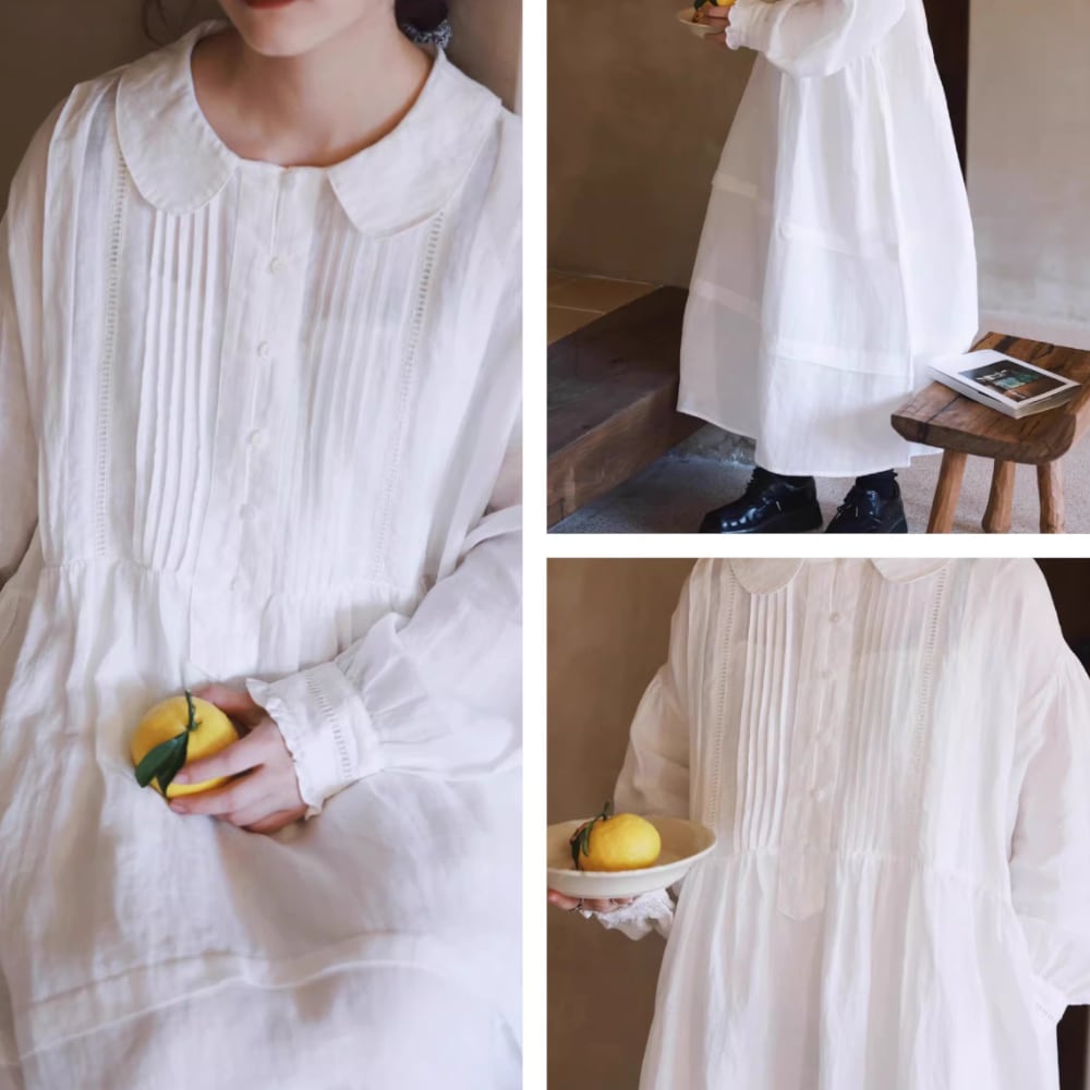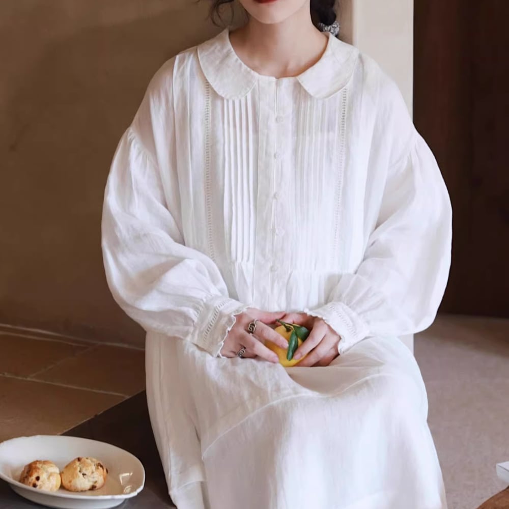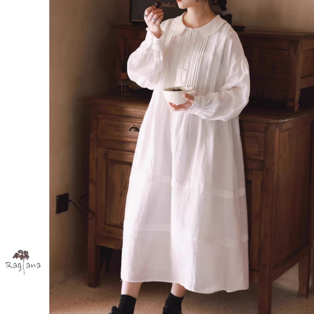ピーターパンカラーと、胸元のピンタックが可愛いリネンワンピース。