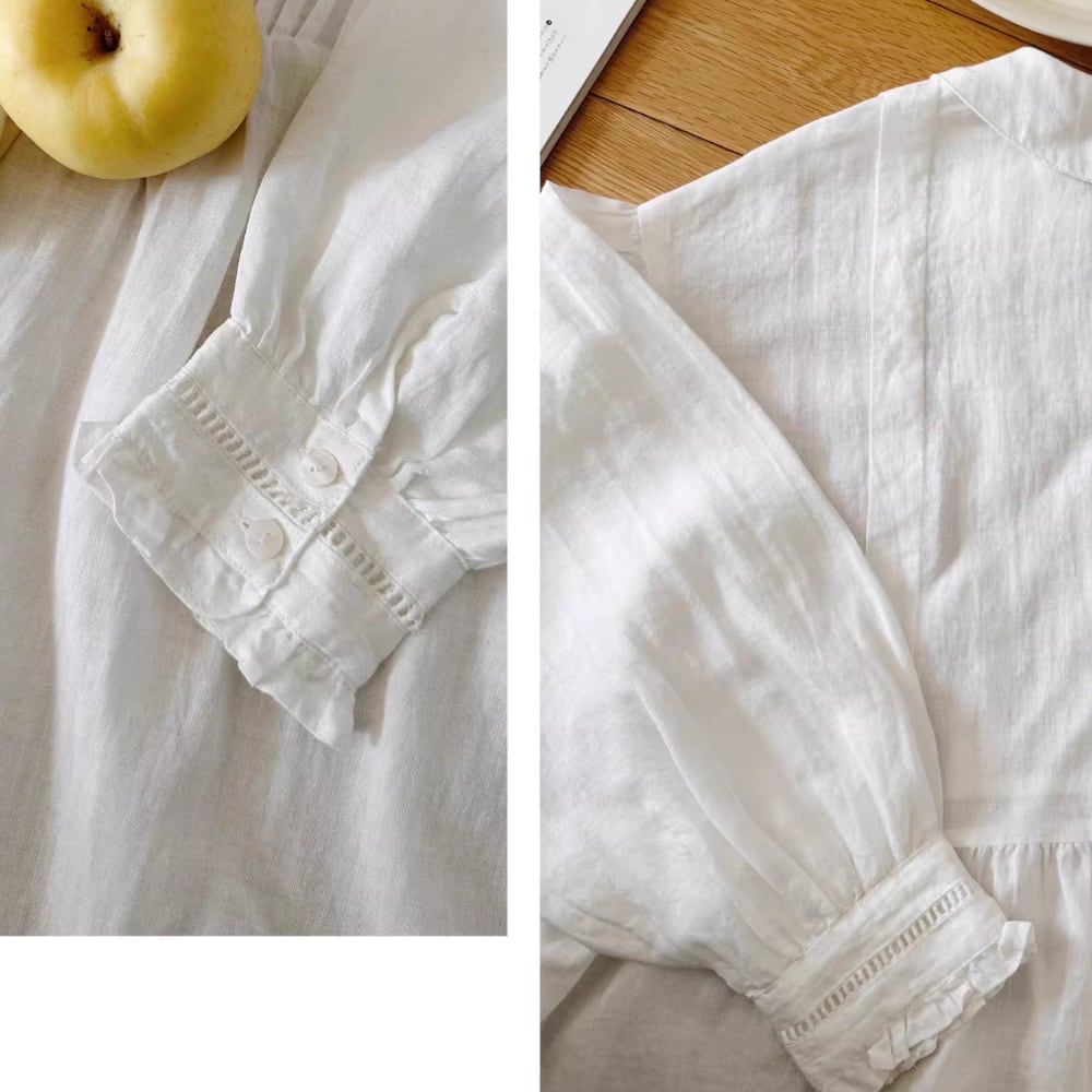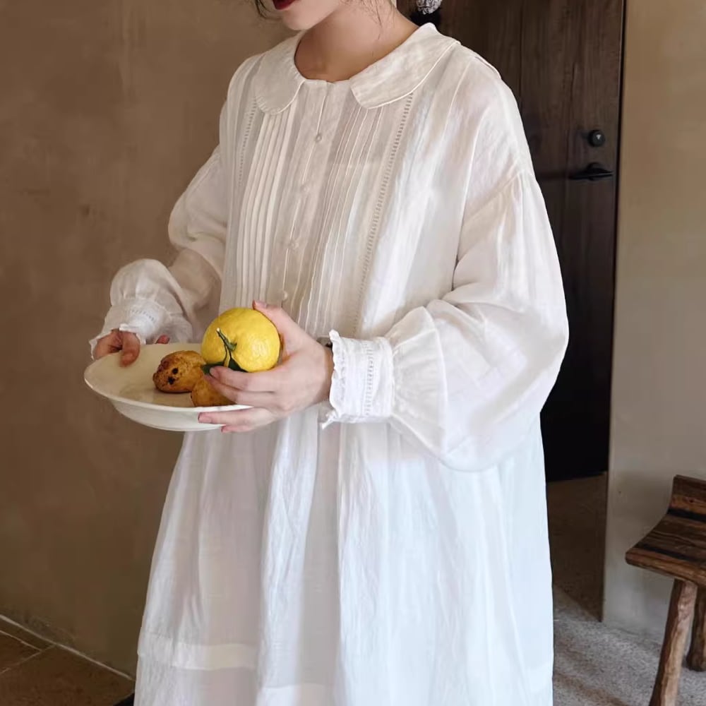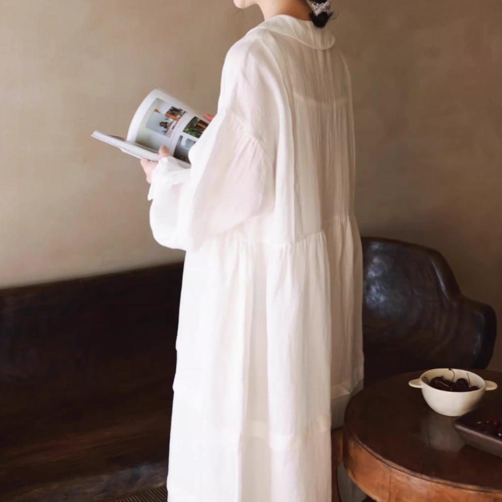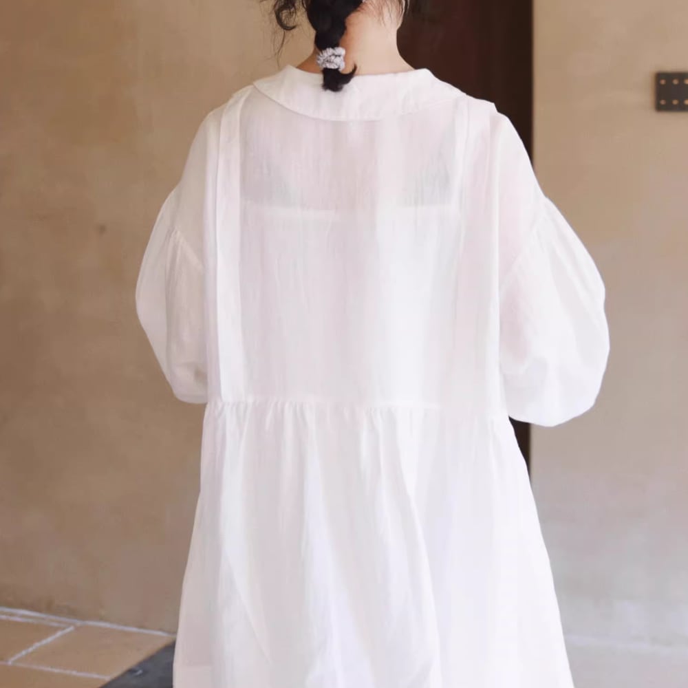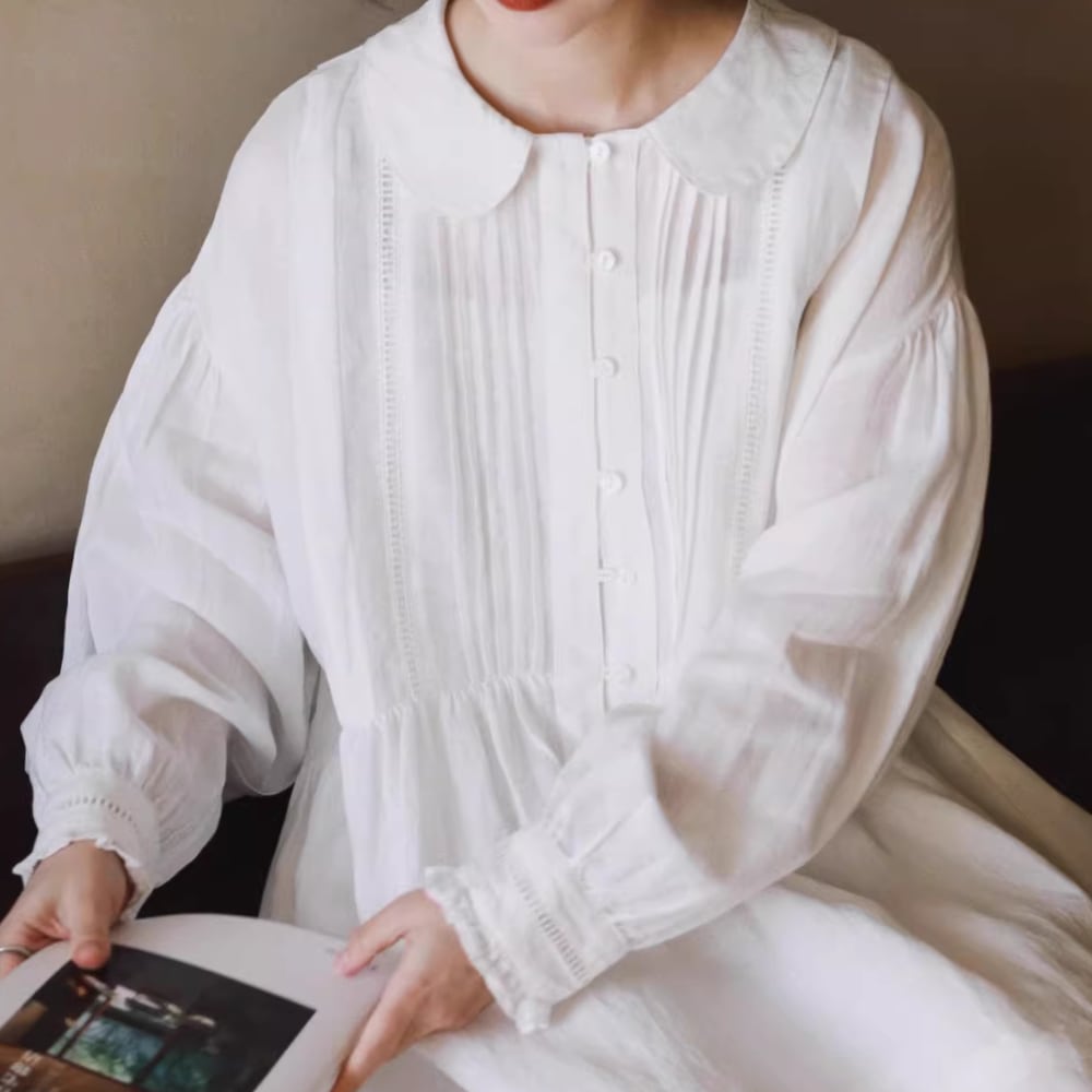 ピーターパンカラーと、胸元のピンタックが可愛いリネンワンピース。