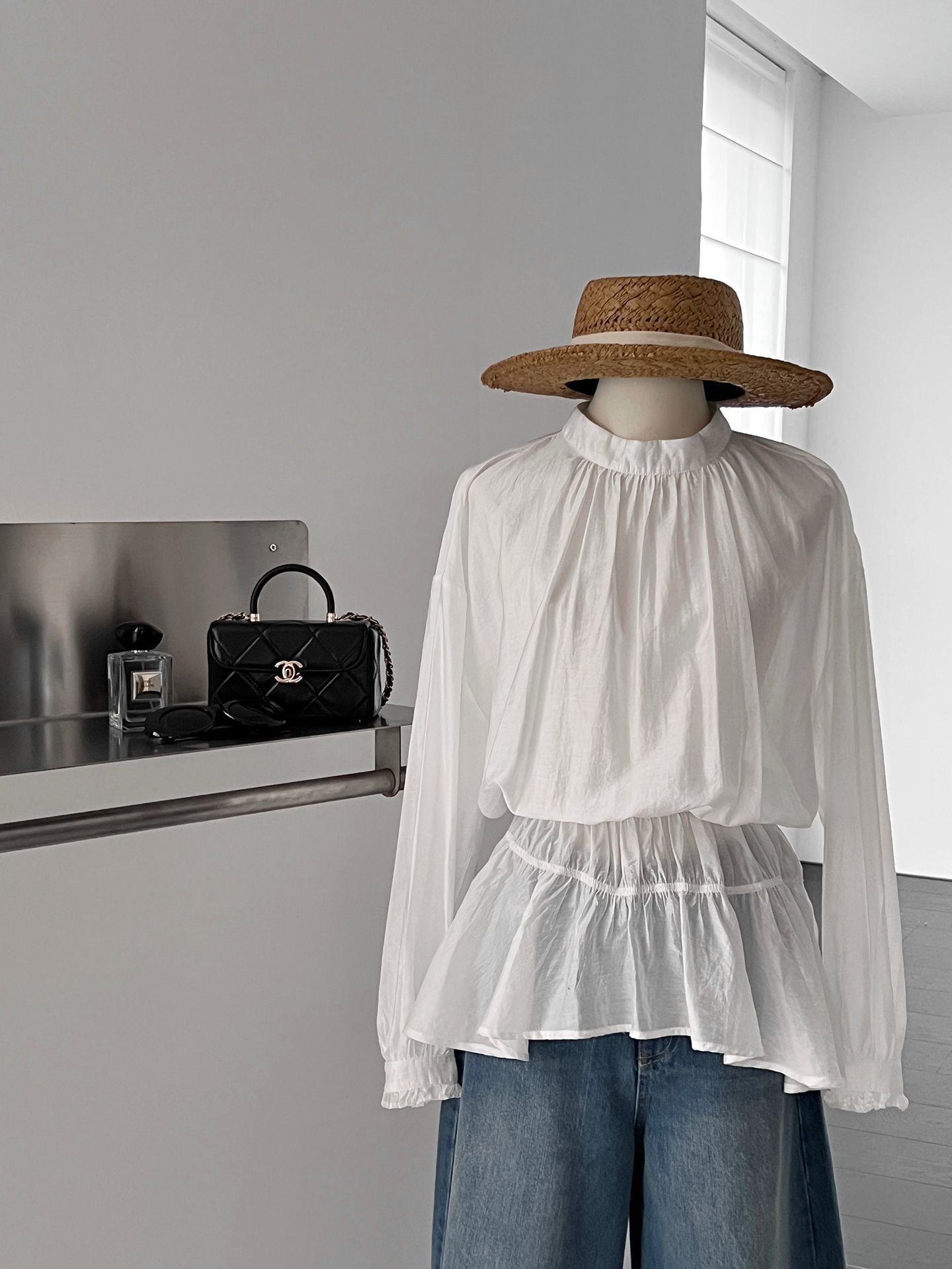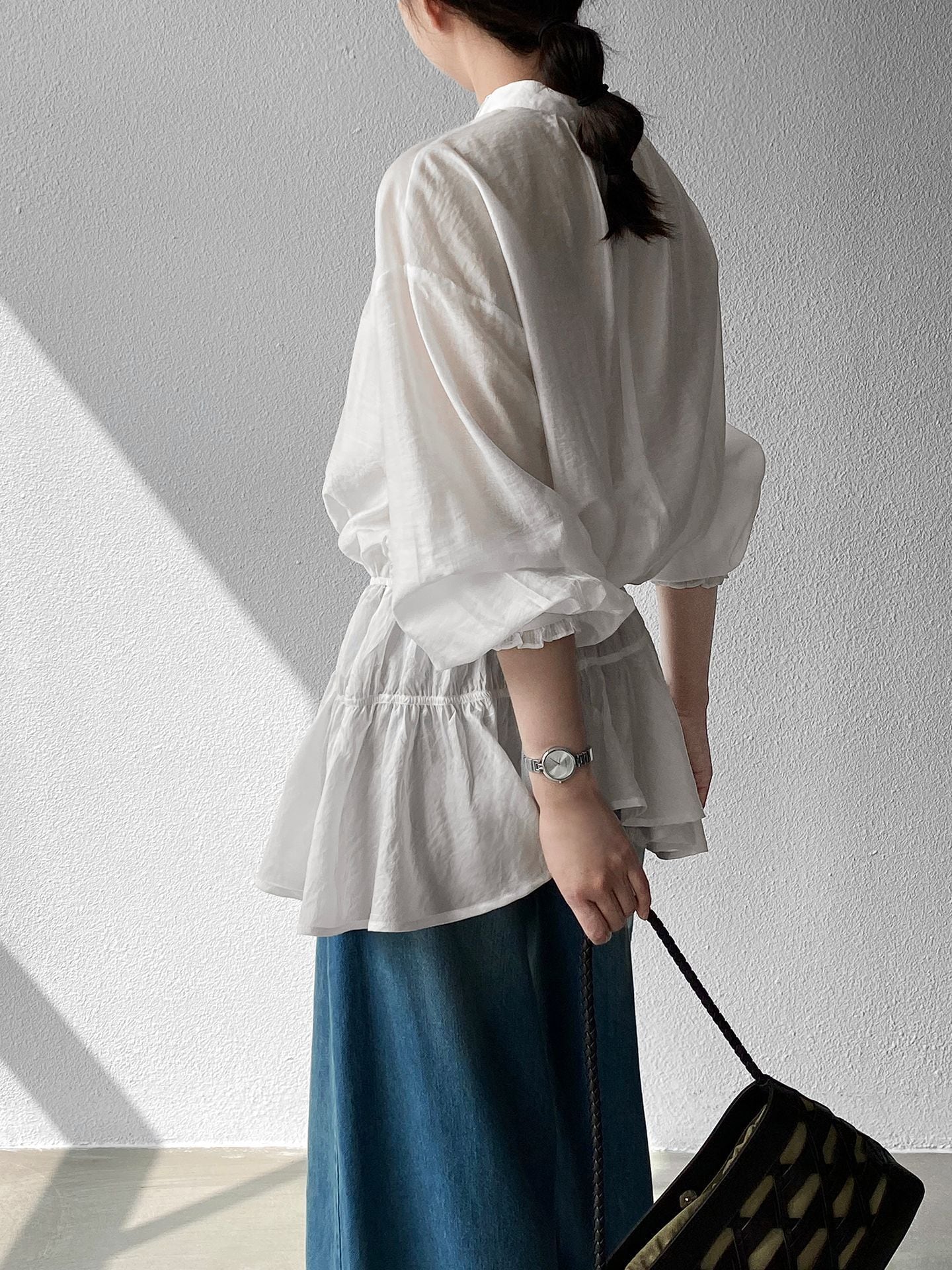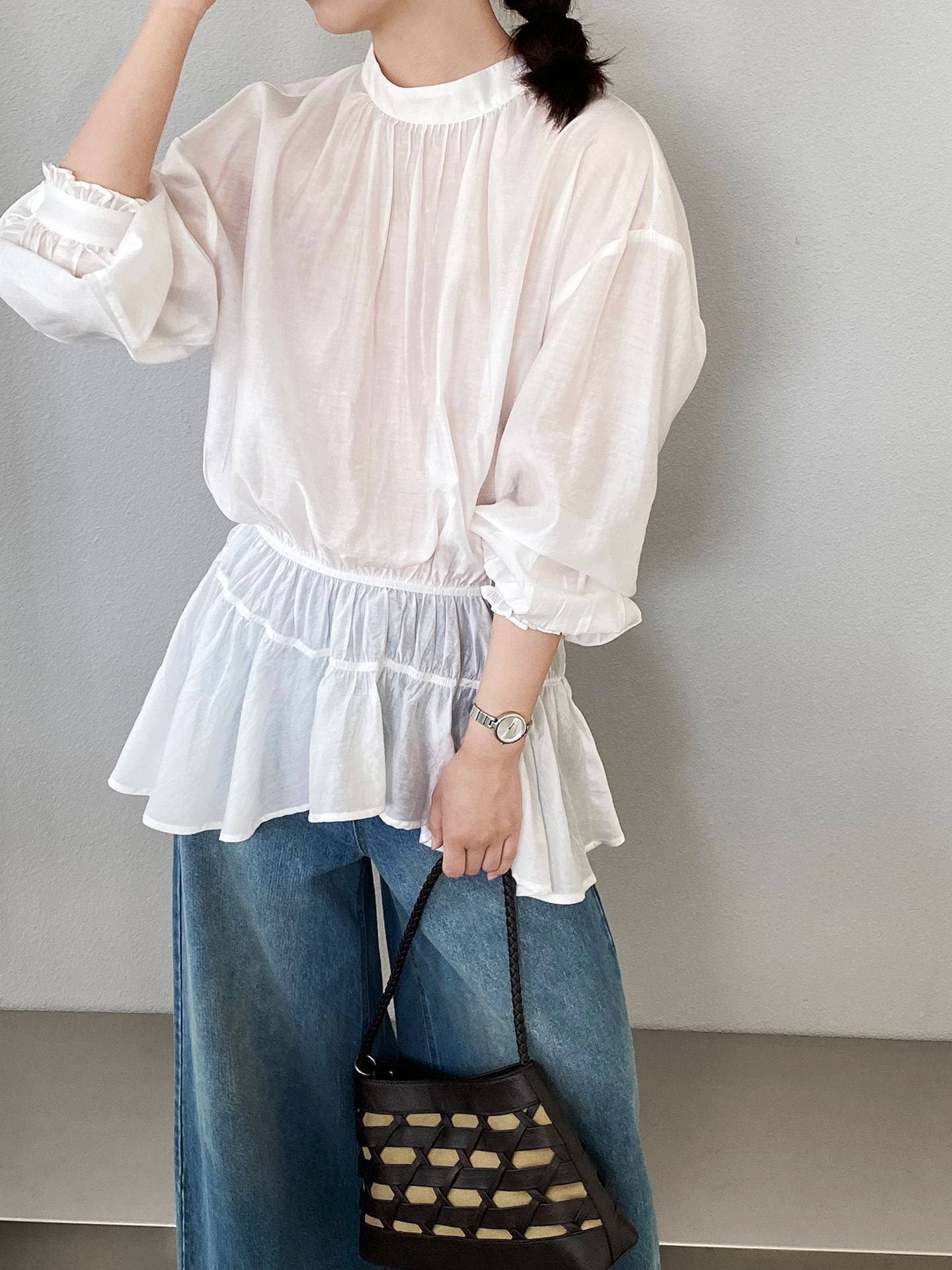 トレンドの透け感素材を使用した、上品なペプラムブラウスが登場