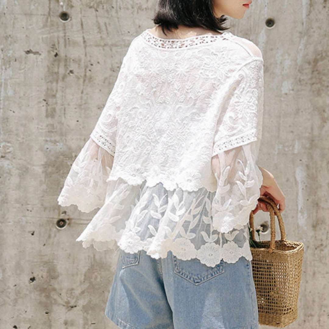 繊細なカットワーク刺繍が目を引く、主役級の総レースブラウス。