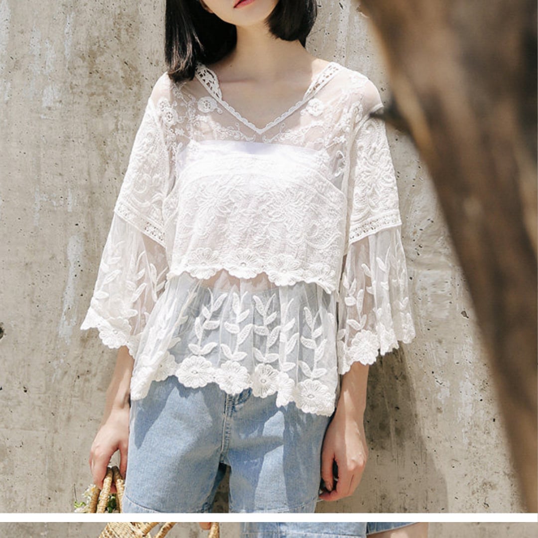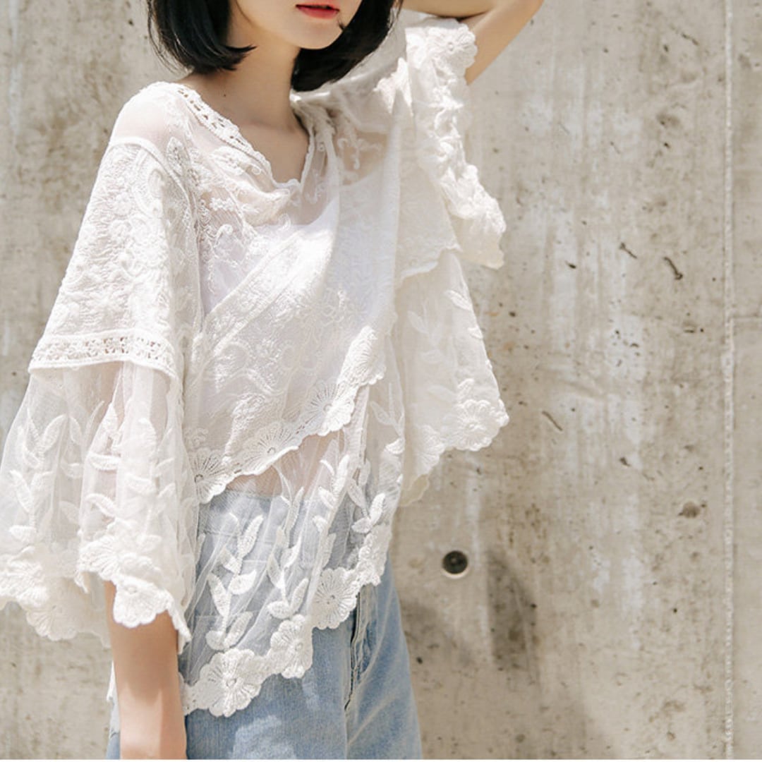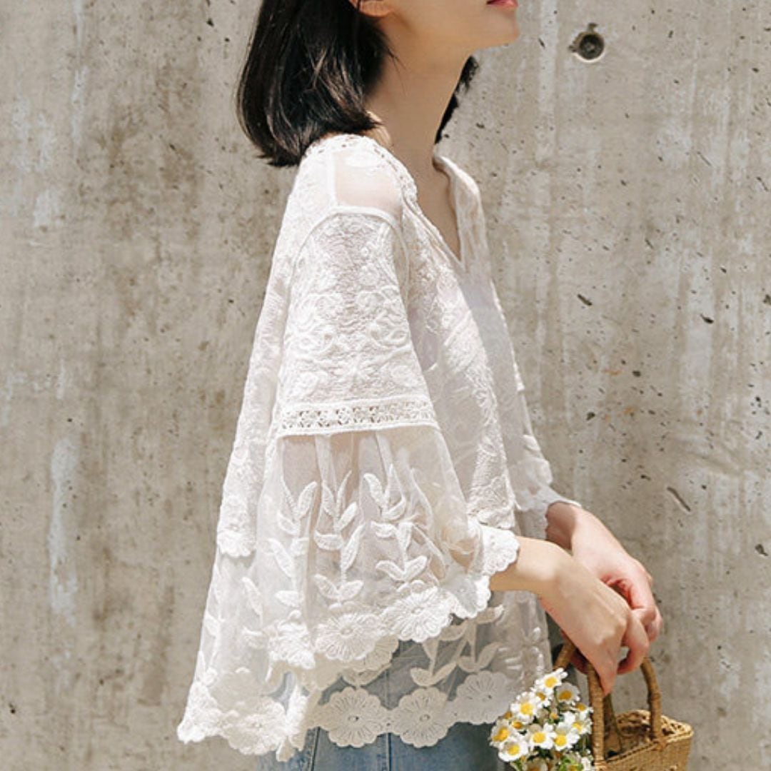 花柄刺繍シアーブラウス ベルスリーブ Vネックブラウス K 260051