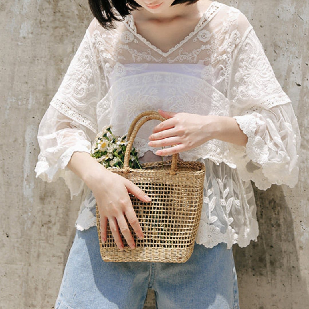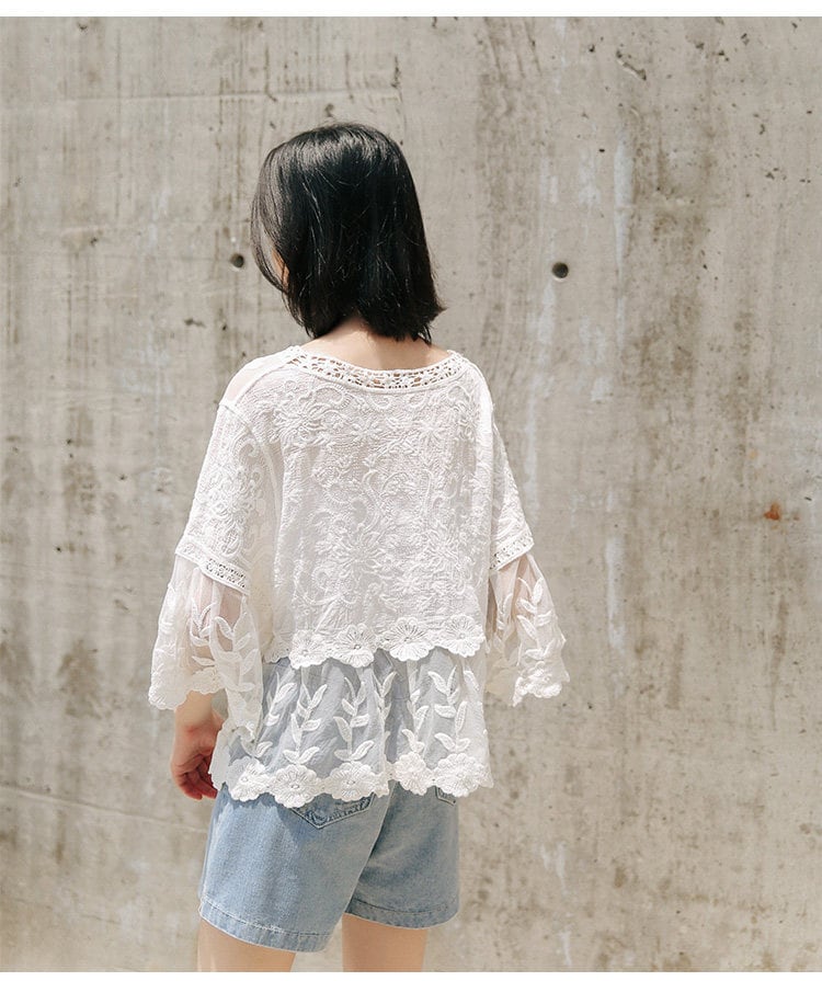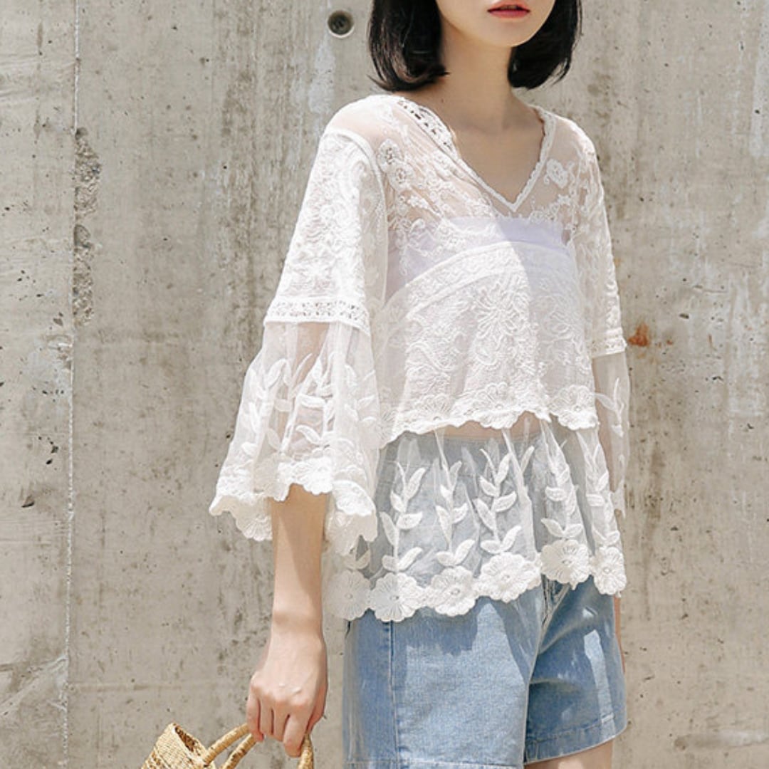 花柄刺繍シアーブラウス ベルスリーブ Vネックブラウス K 260051