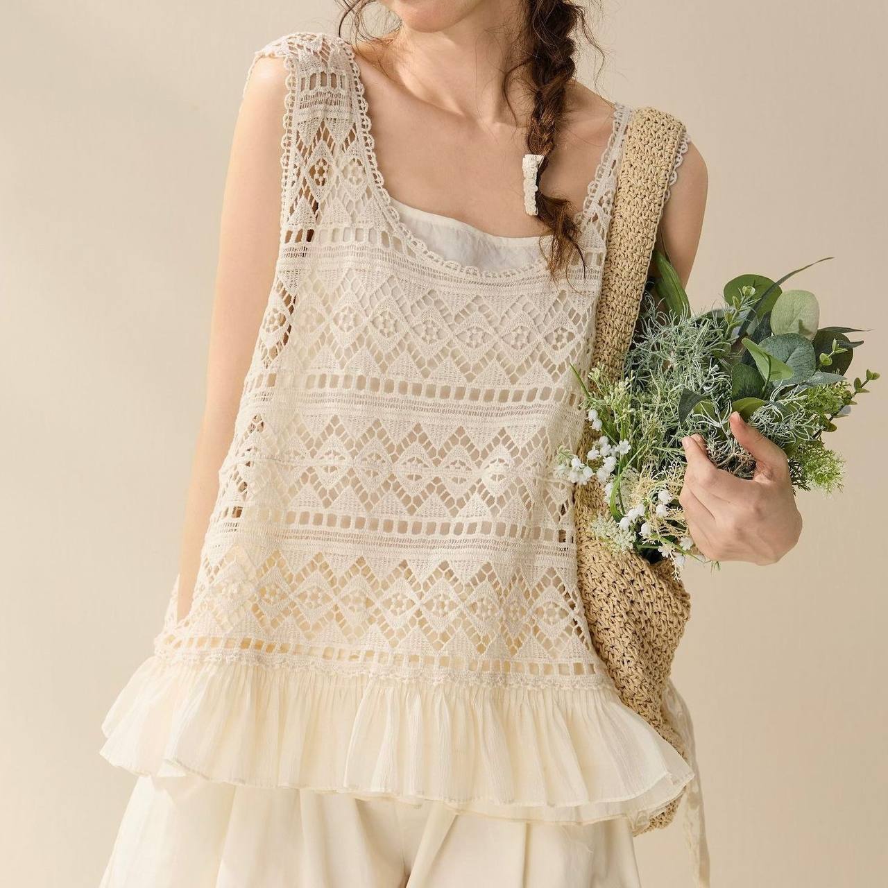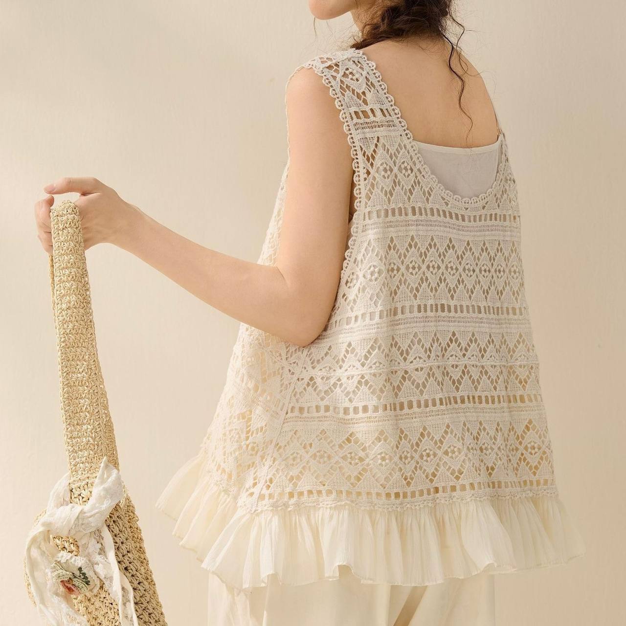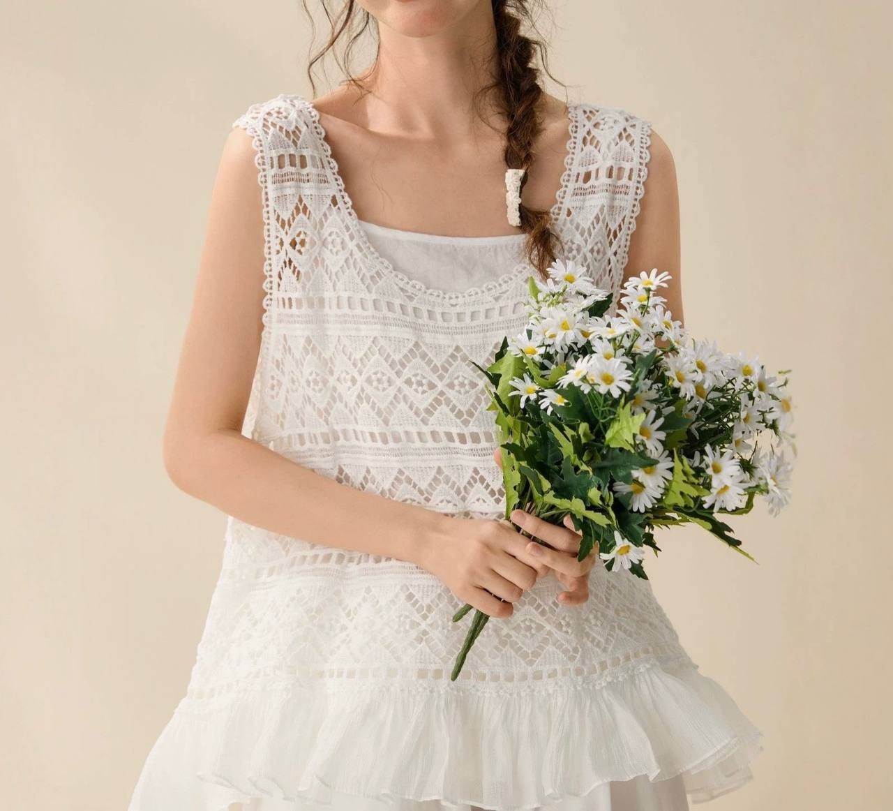 繊細な透かし編みと、ふんわりとした裾のフリルが魅力の