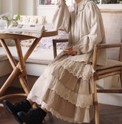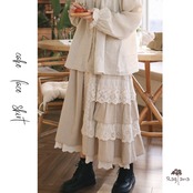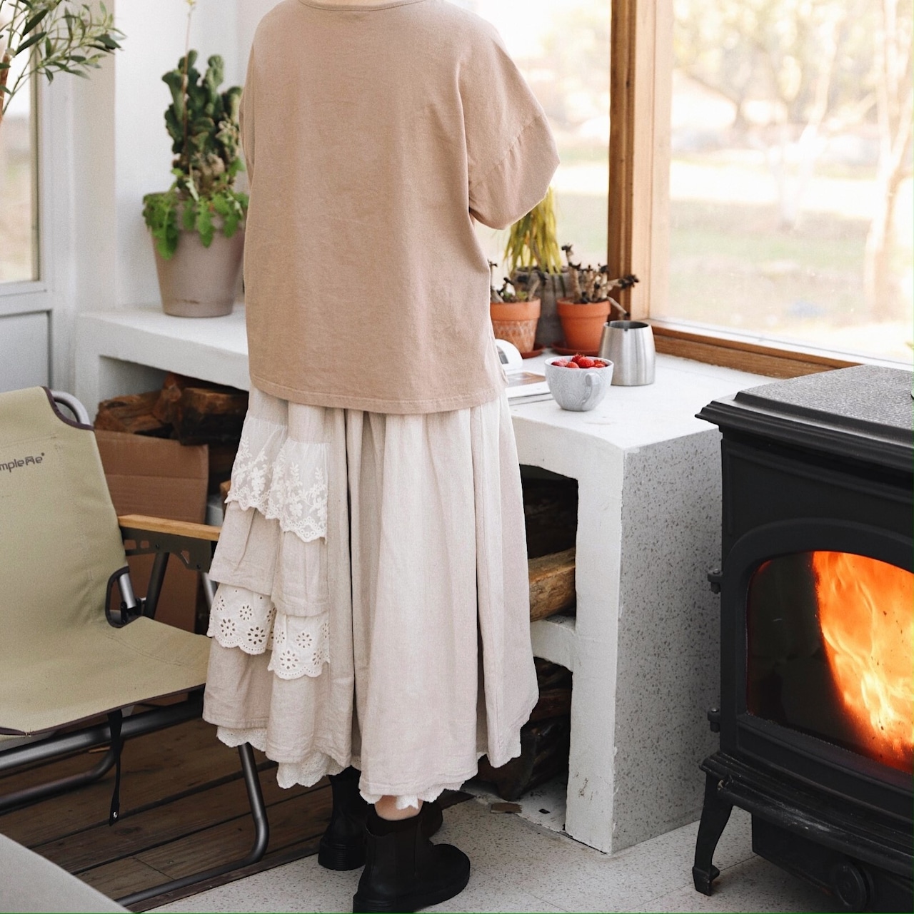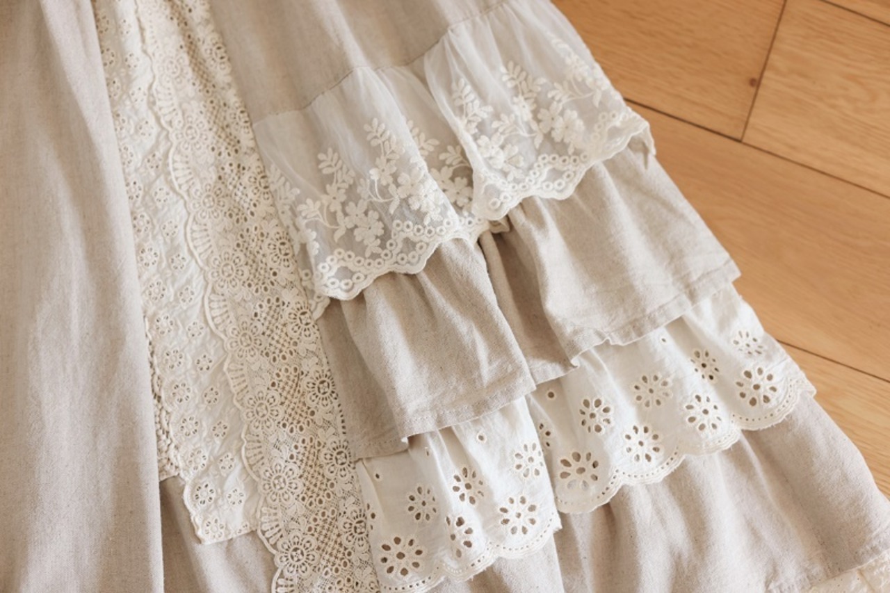 リネンとコットン生地に不規則にデザインされたレースが可愛いスカートです。