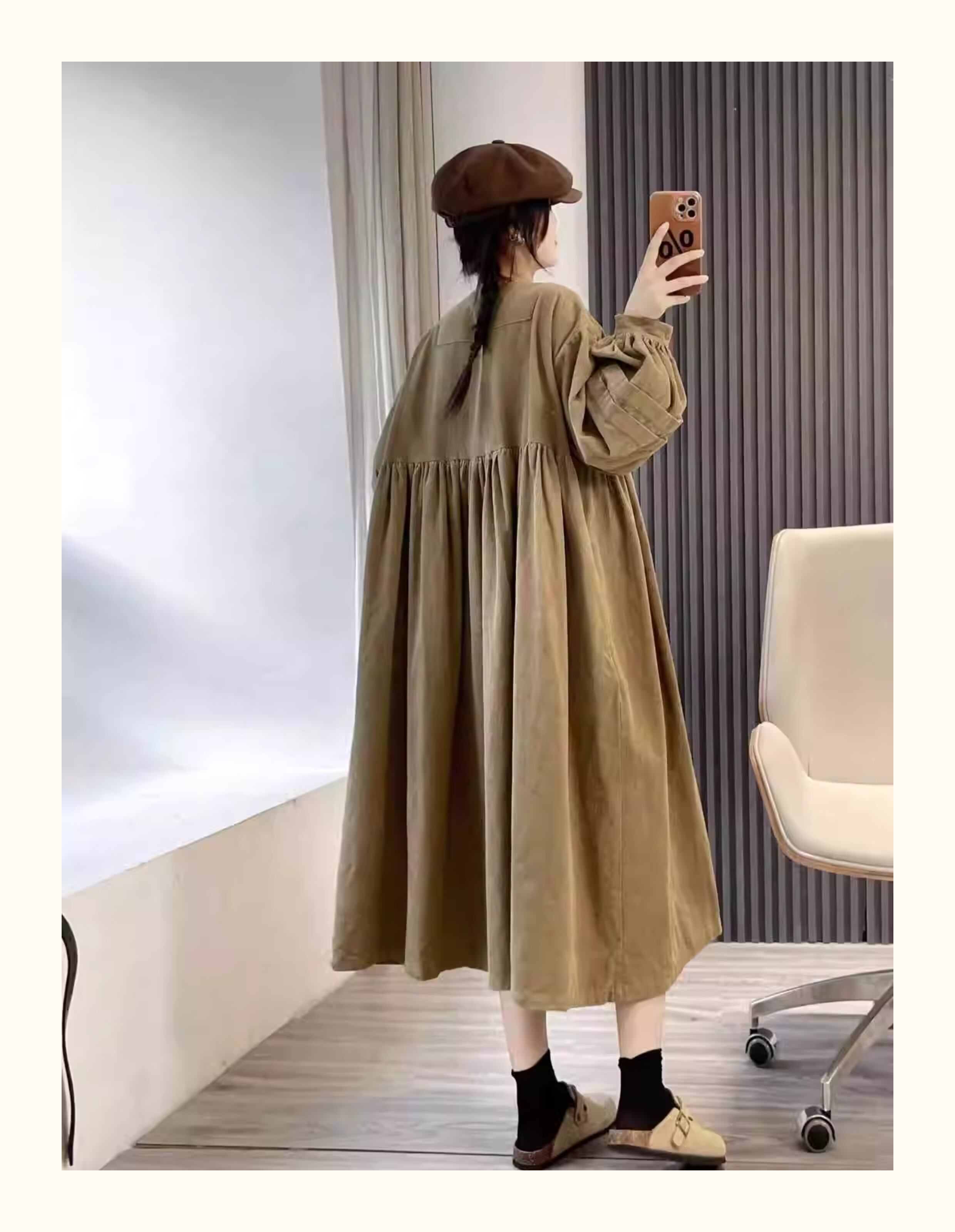 濃紺のコーデュロイに前後のレースが可愛いのワンピースです。