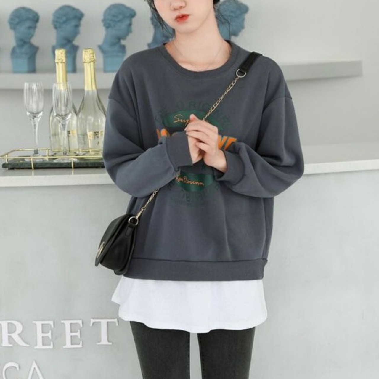 丈が短いトップスの時に、バックシルエットが気になる~という時に、フェイクのシャツを重ねることでパンツもお洒落にコーデ。4色展開。トップスのカラーに合わせてどうぞ!