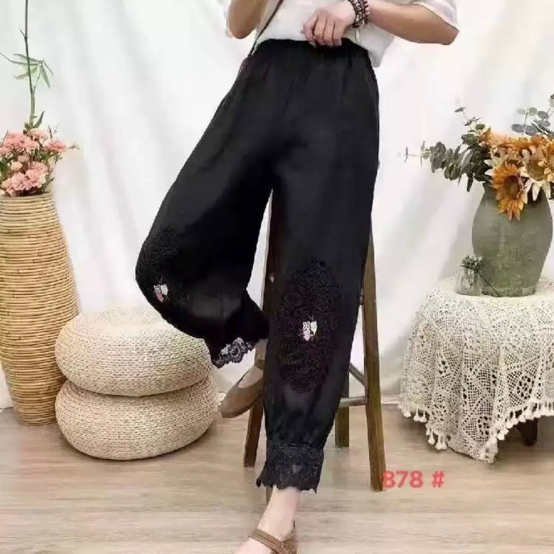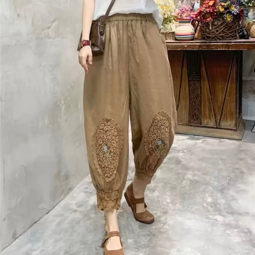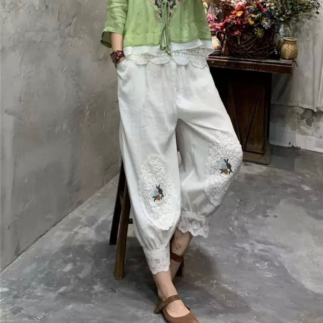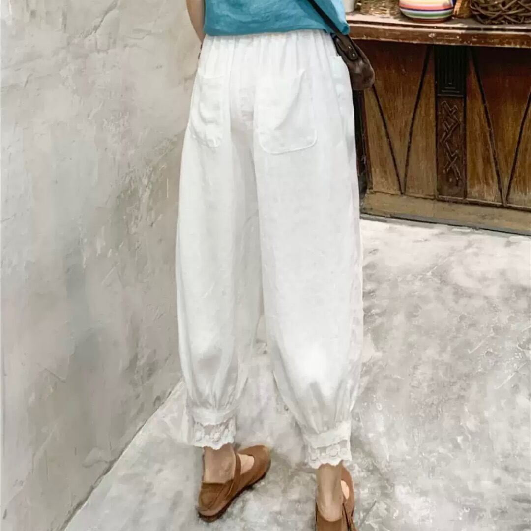 膝あてにお花のワッペンやレースが可愛いコットンリネンのバルーンパンツです。
