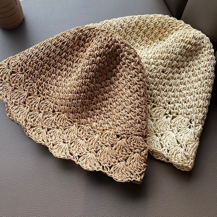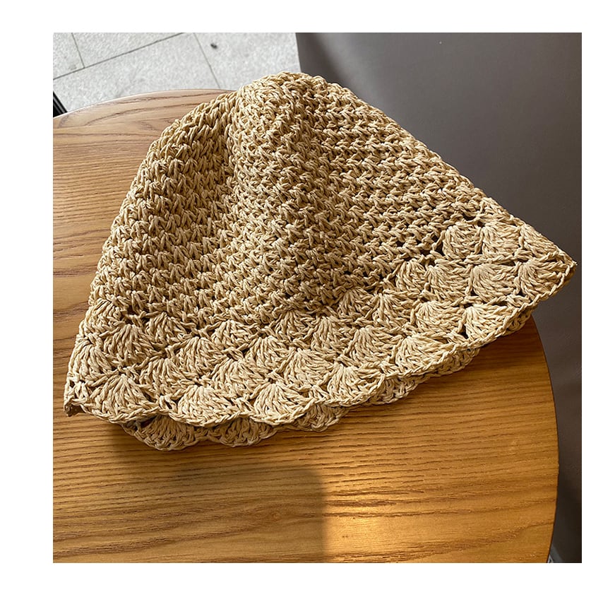 手編みの麦わら帽子 折りたたんで、すぽっと被ることができます。裾の扇型がフリルっぽくて可愛い〜どんなファッションにも合わせやすいです。