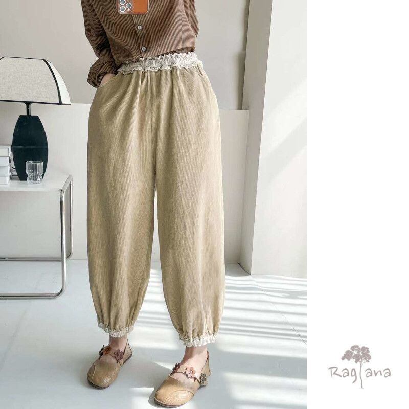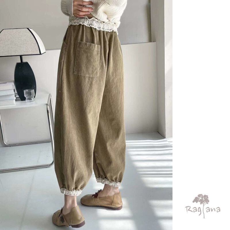ウエストと裾のレースがアクセントで可愛いコーデュロイのバルーンパンツです。