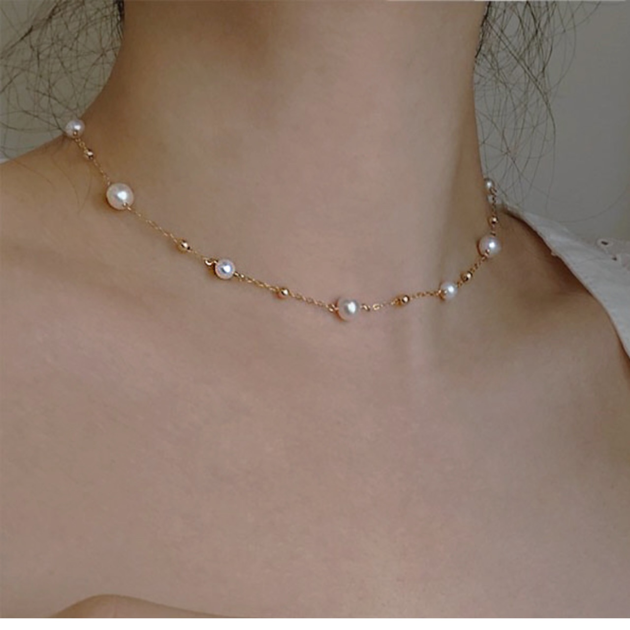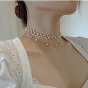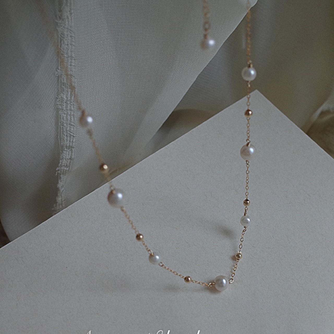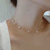 パールがとチェーンの融合で華奢な印象の儚いネックレス。