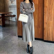 ニットトップスとプリーツスカートを合わせた重ね着風のワンピース。