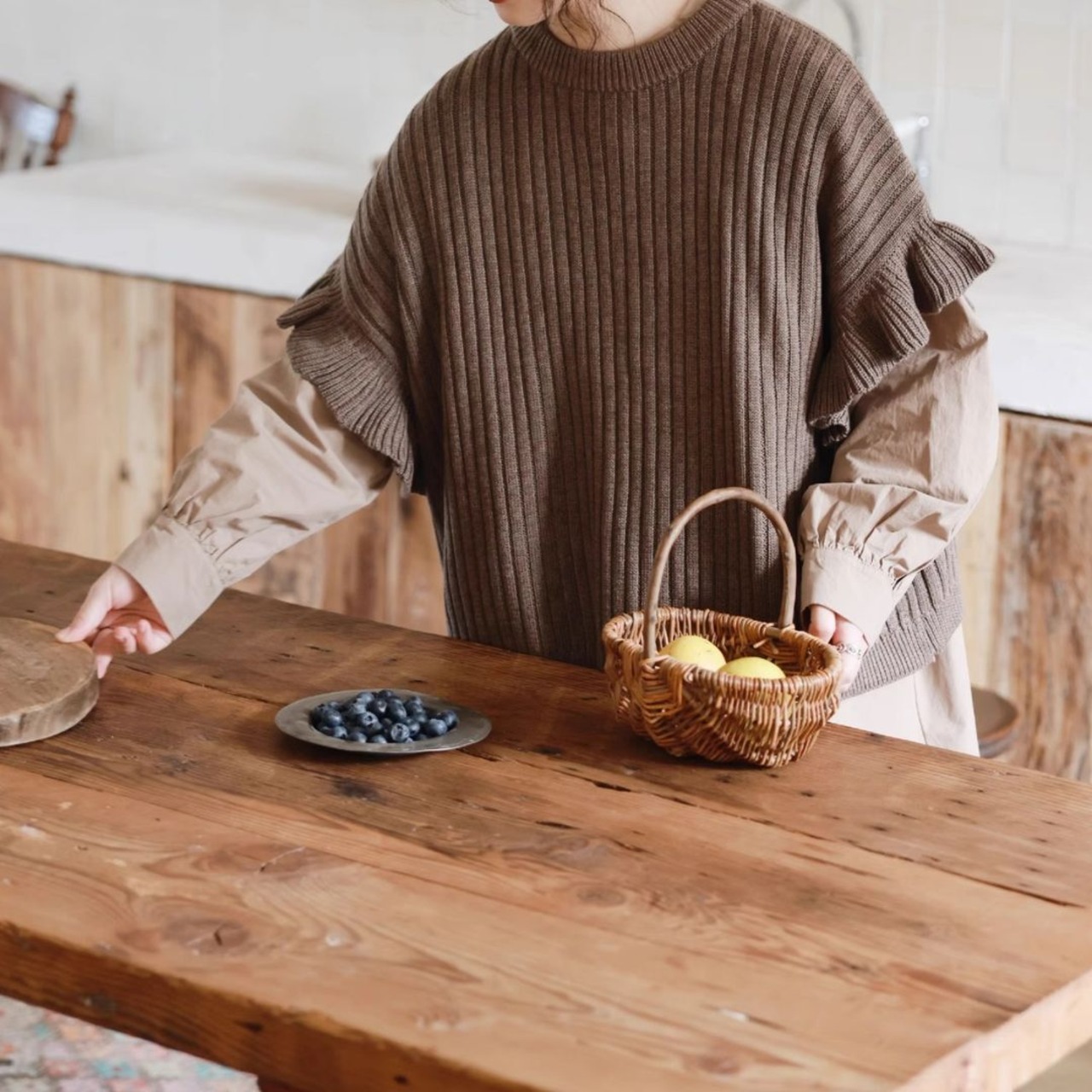 ゆったりとしたシルエットのリブニットトップス。