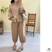 シャーリングの入った袖と刺繍がアクセントになったブラウスです。