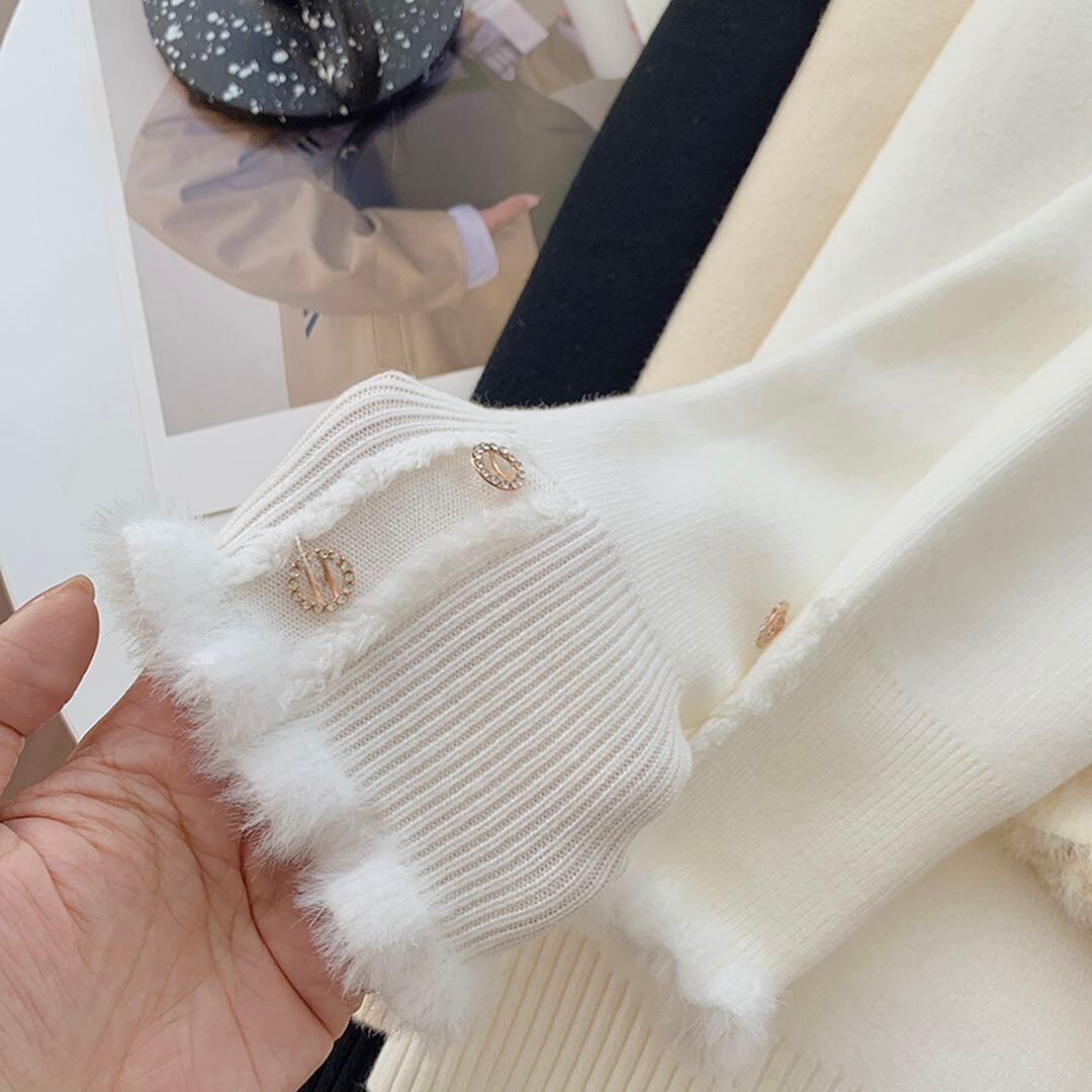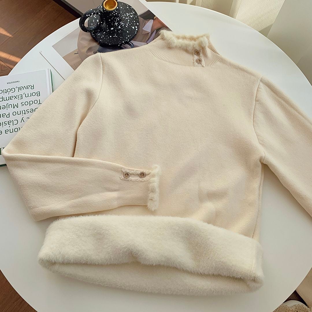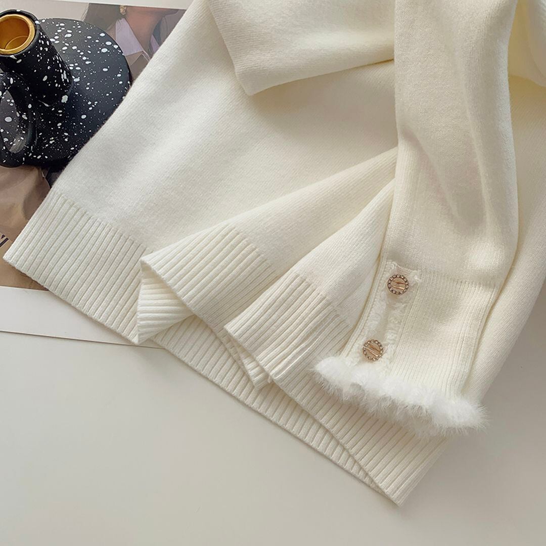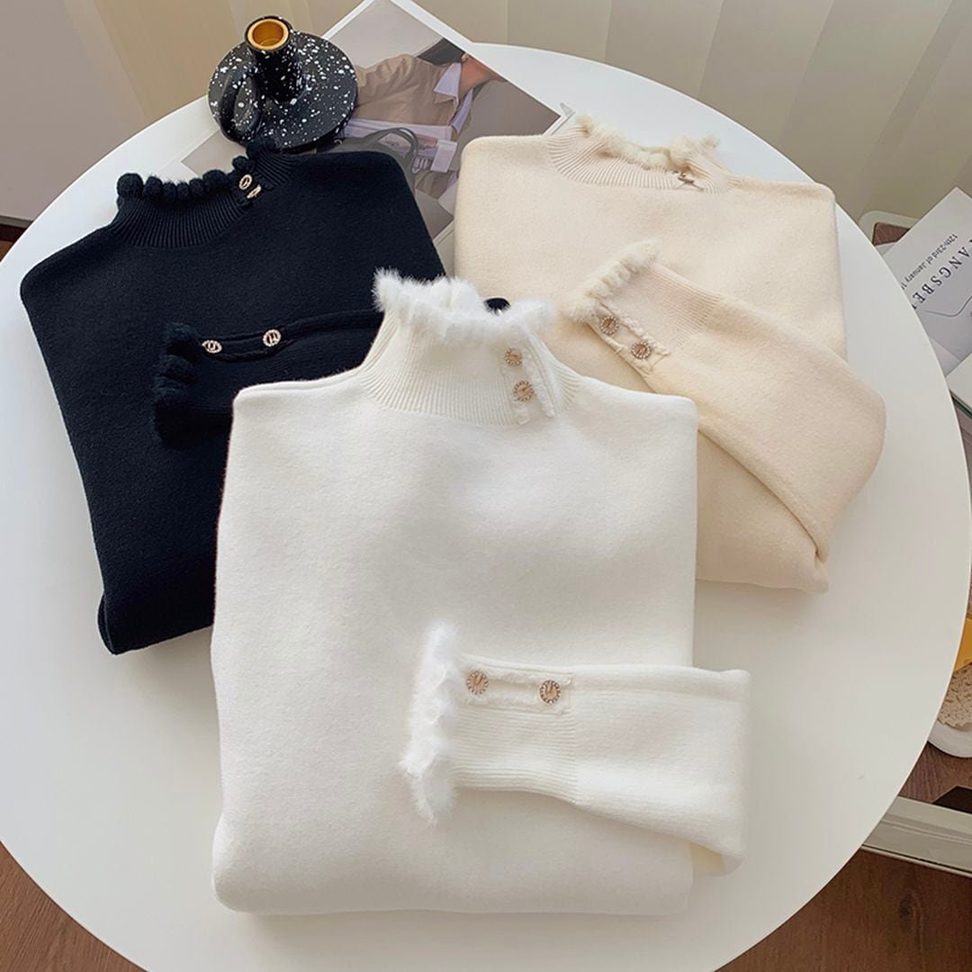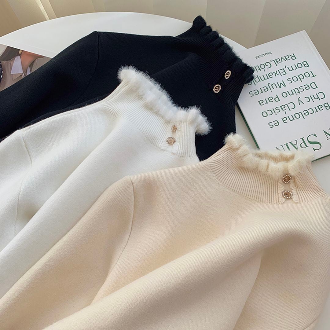 ネックラインのボタンがポイントのリブニットトップス。