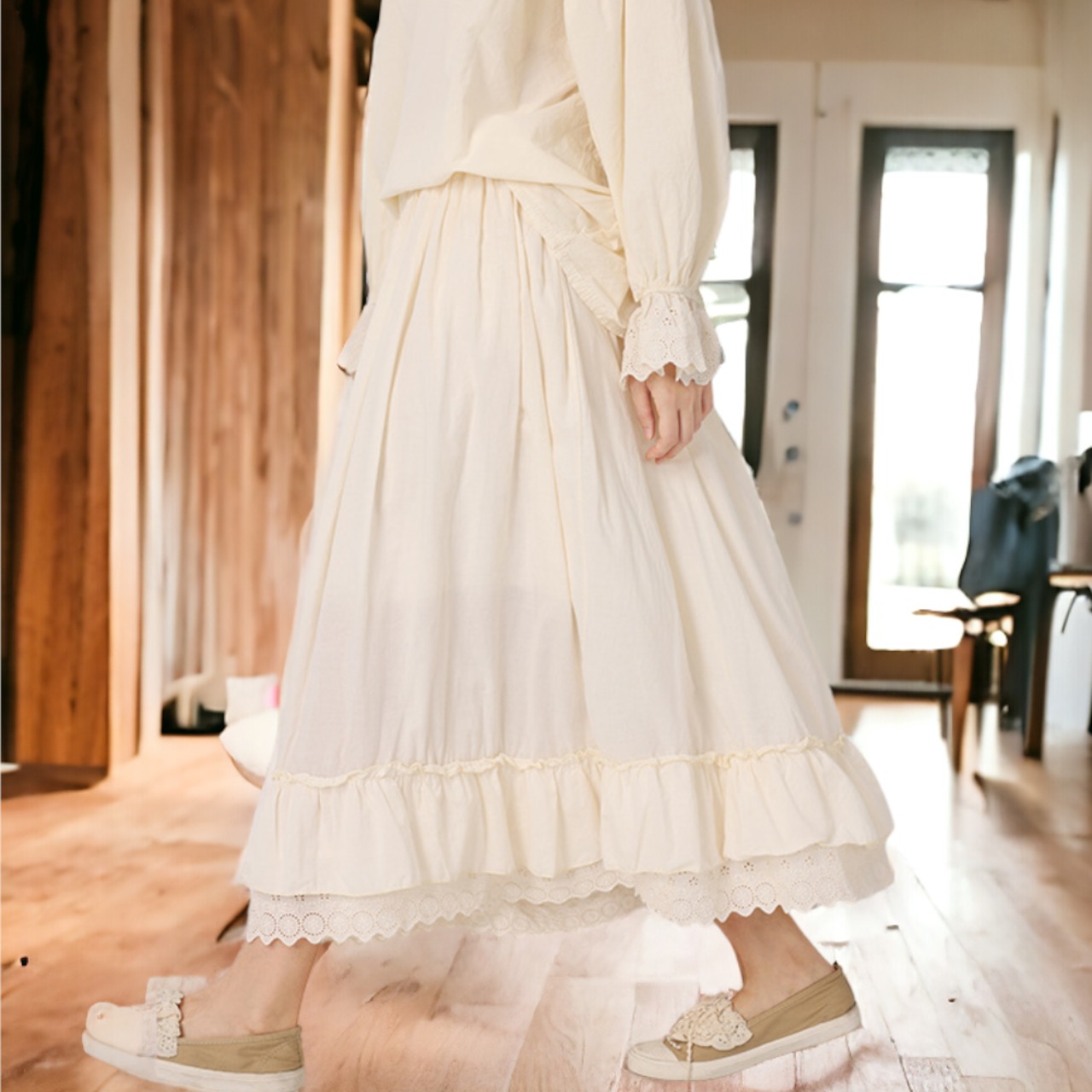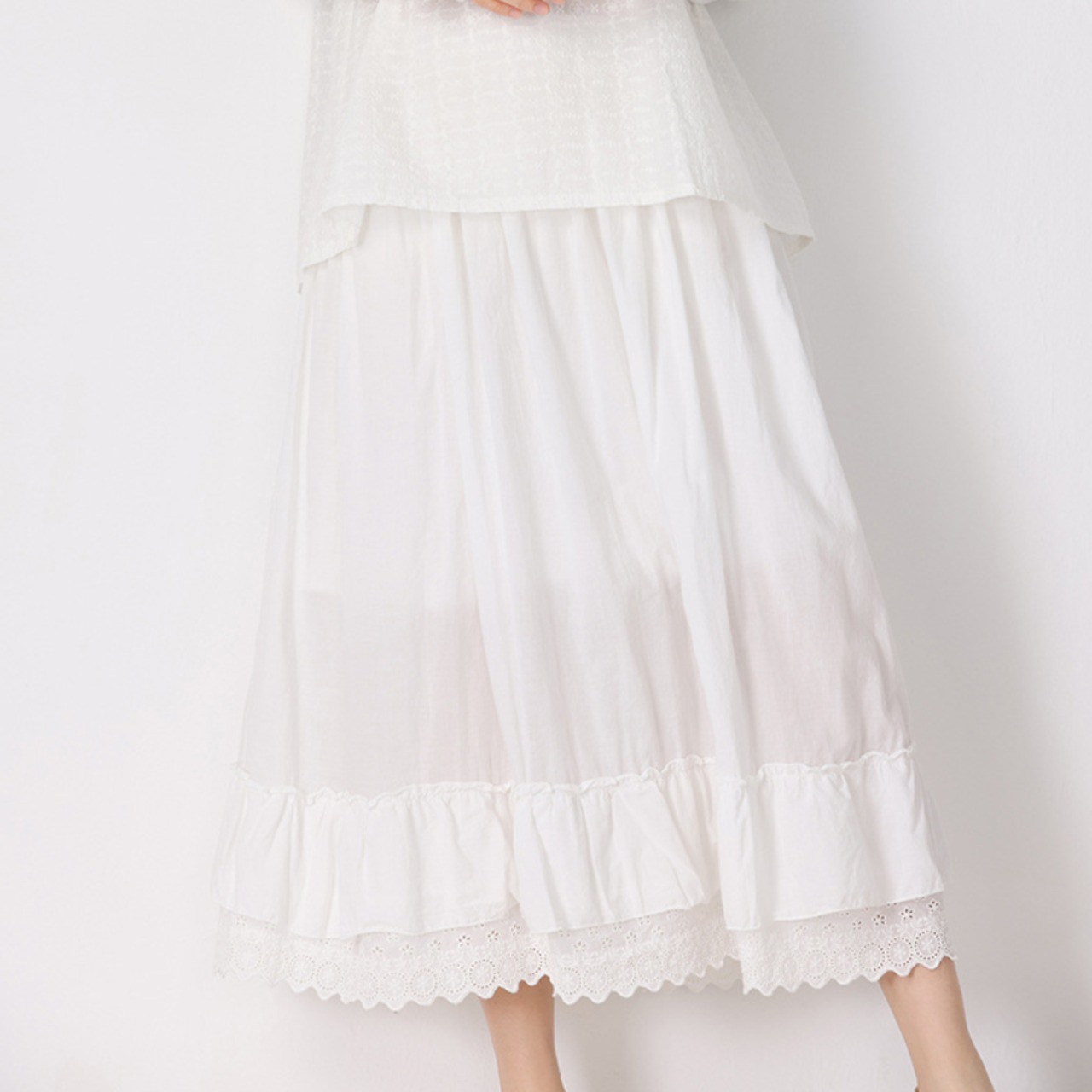 繊細なギャザーレースが、女性らしい柔らかさを引き立てます。フェミニンなデザインでありながら、幅広いスタイリングに対応できます。