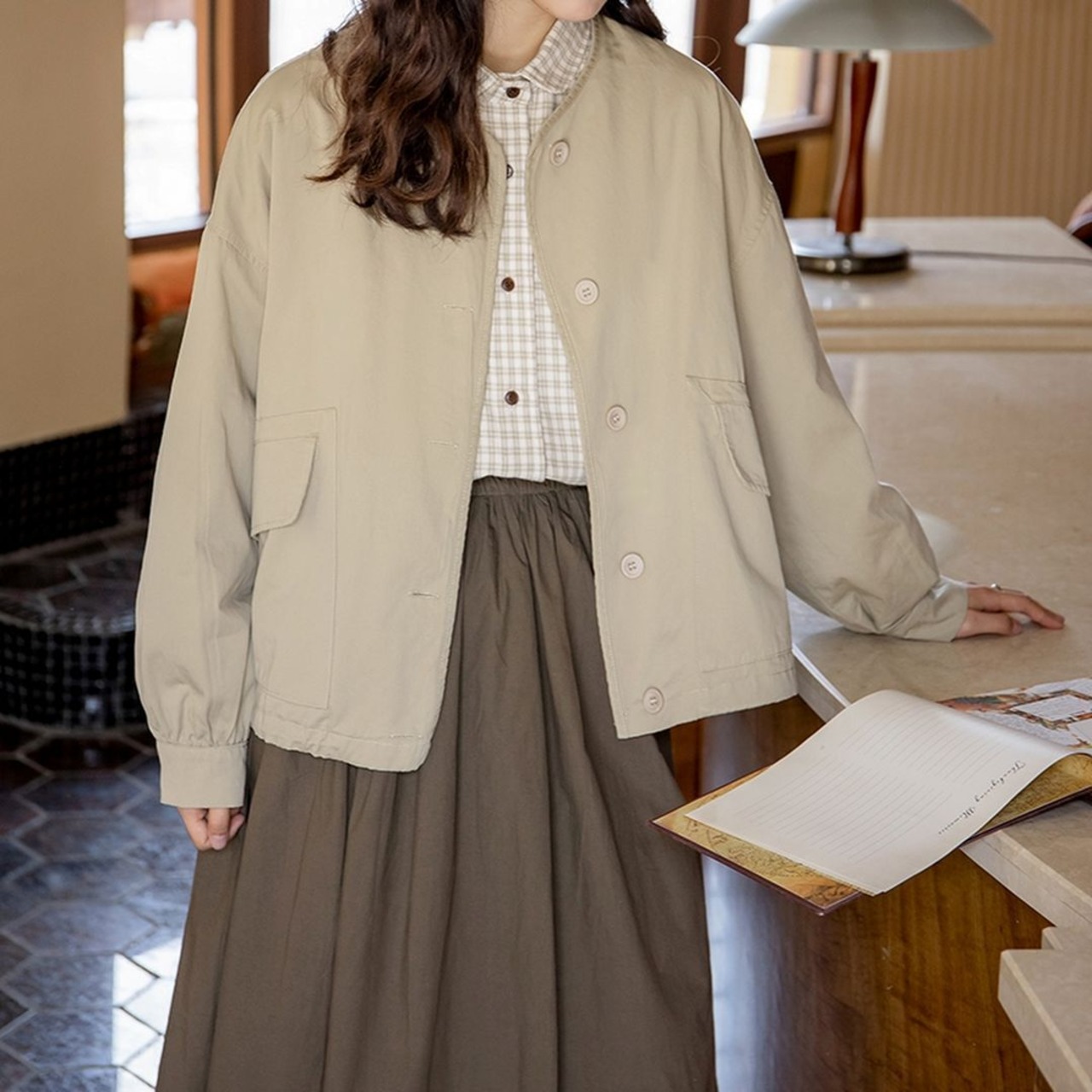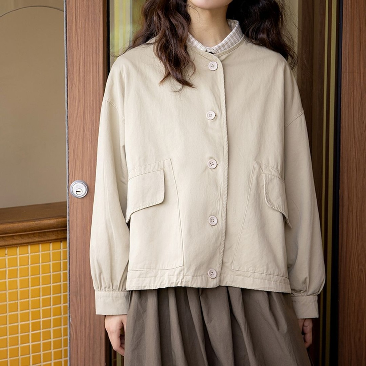 襟のないジャケットです。
