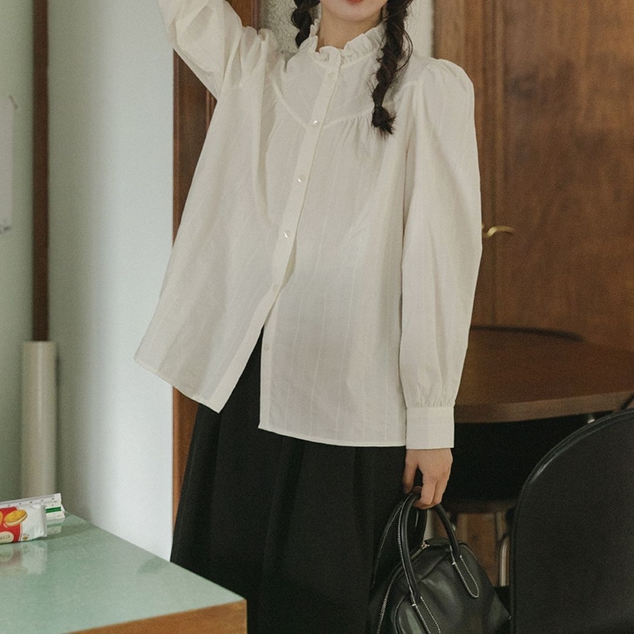 フェミニンなフリルネックのブラウスです。