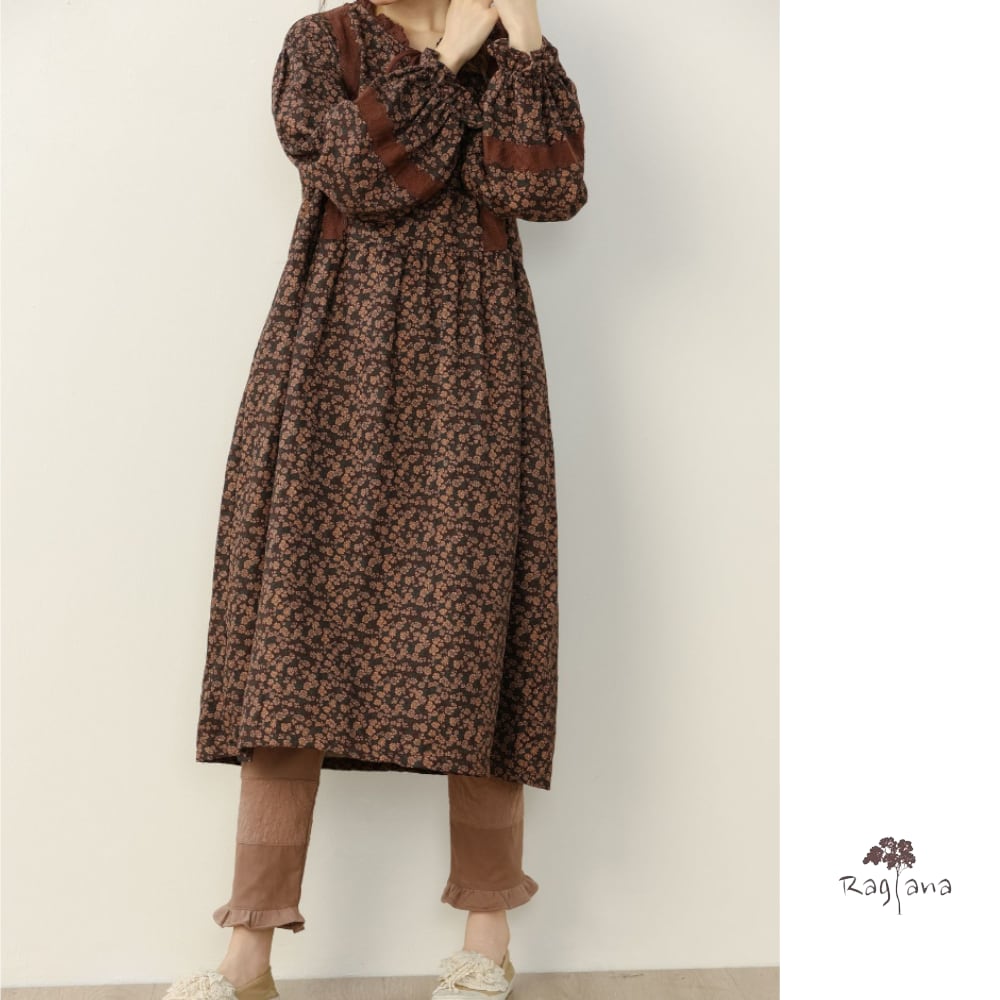小花柄フリルテープ 長袖ワンピース Y 11119