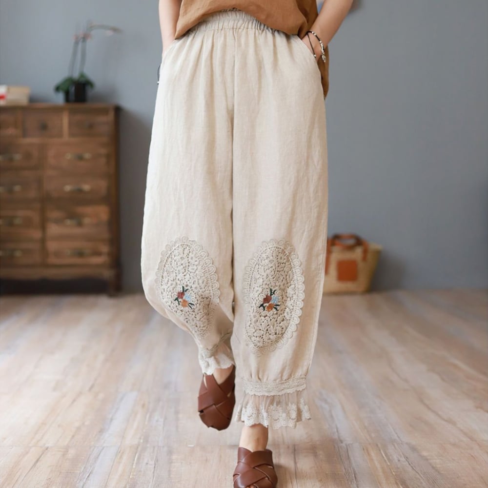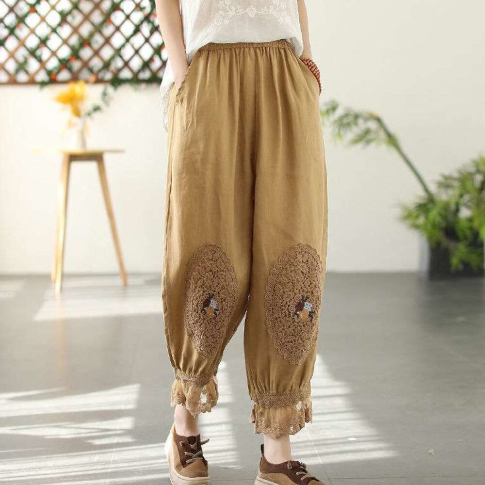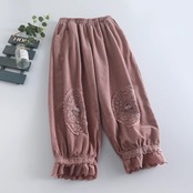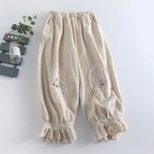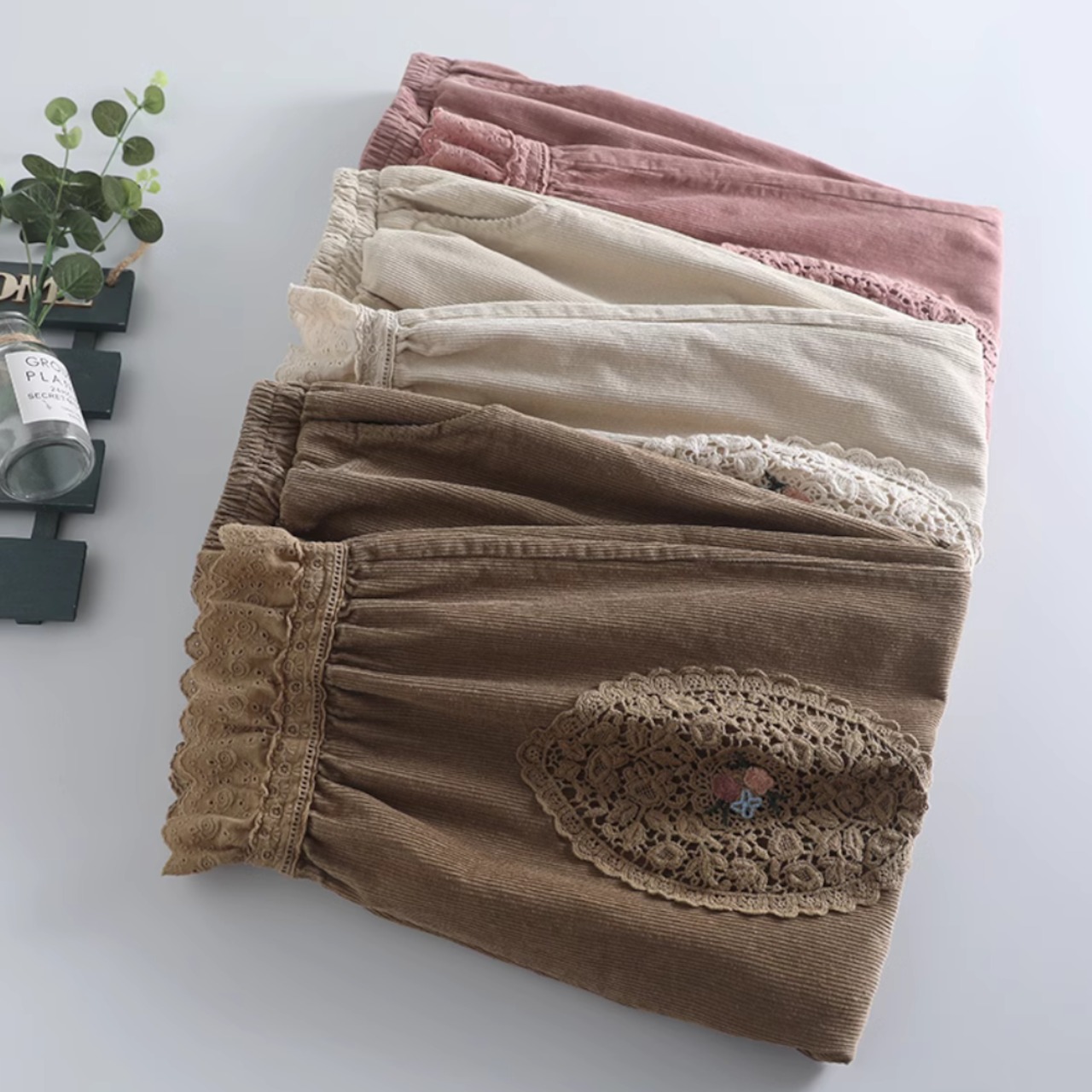 コーデュロイに裾のフリルやレース刺繍が可愛いルーズなパンツです。