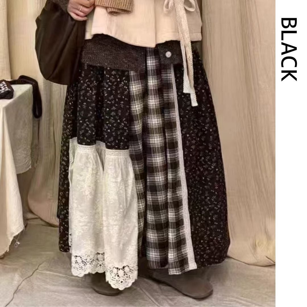 小花柄やチェック柄のガーリーなパッチワークのスカートです。