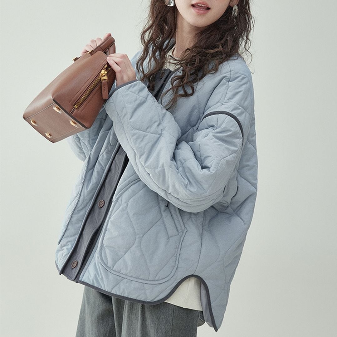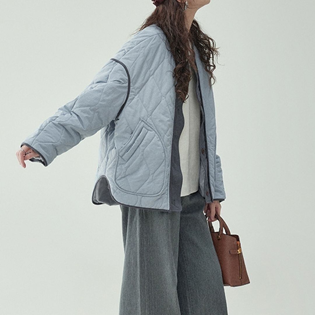 ノーカラーでハイネックのインナーやマフラーが映えるデザイン♪